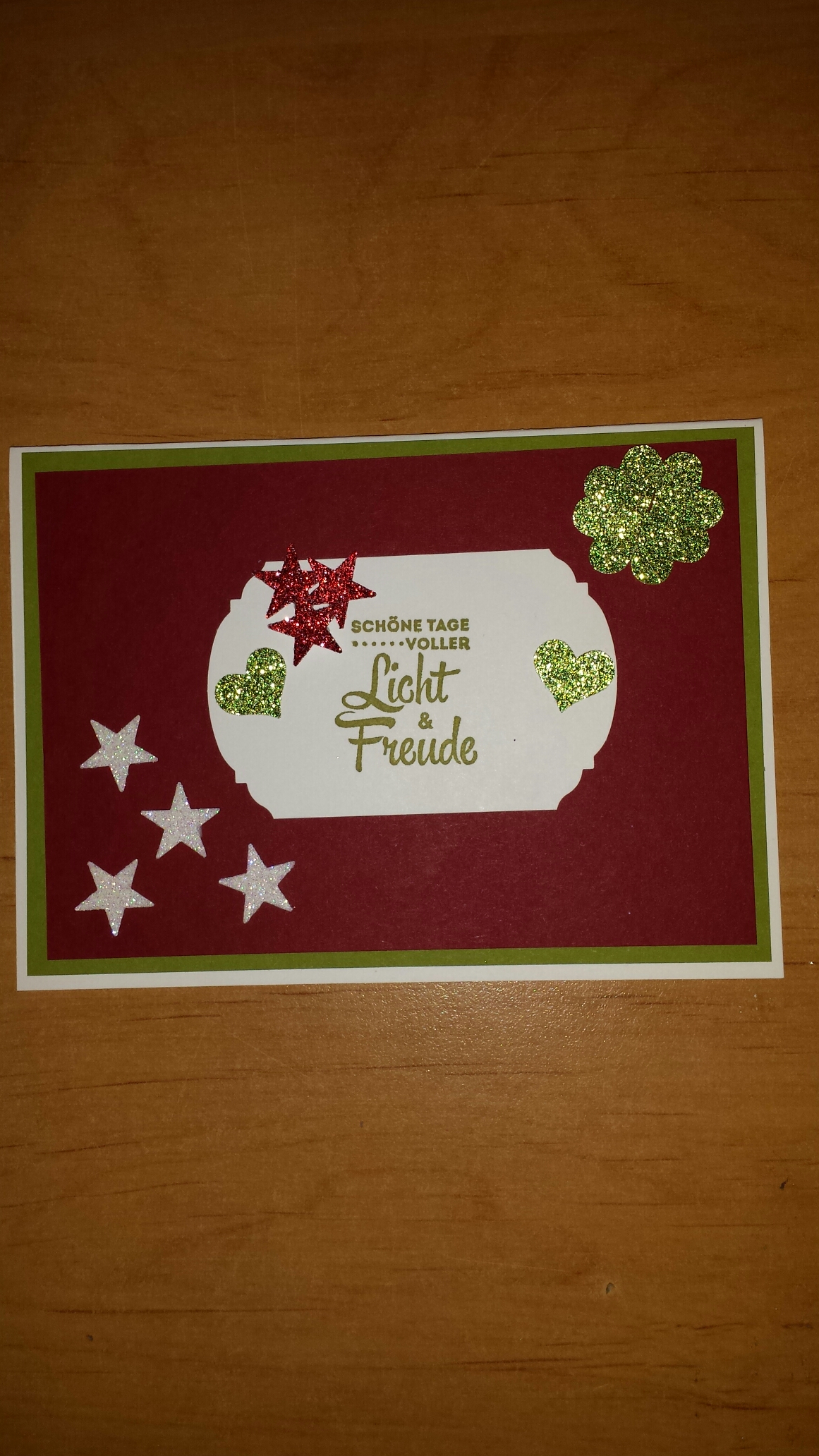 Aber dann fiel mir ein, dass die kleine Sternstanze in einem Set war, in der auch eine kleine Herzstanze war. Und dann fiel mir der Spruch „Schöne Tage voller Licht und Freude“ ein. Das kann man doch auch zum neuen Jahr wünschen, oder?