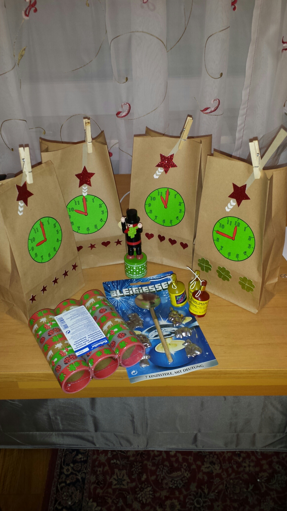 Die Kids dürfen zunächst ab neun das Wohnzimmer mit Luftschlangen verschönern. Um zehn können sie Bleigießen. Um elf erhalten sie einen Glücksbringer und um viertel vor zwölf startet das Tischfeuerwerk. Ich hoffe, die Kids haben ihren Spaß damit.