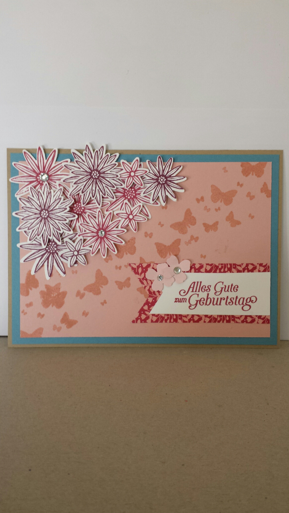 Gestern habe ich meinen Sohn gebeten, aus meinem Cardstock zwei Farben für eine Glückwunschkarte auszusuchen. Ich weiß immer noch nicht, ob ich das noch mal machen werde. Er suchte nämlich den Cardstock ozeanblau und den Cardstock kirschblüte aus. Hm… ich hätte diese Kombi wohl eher nicht gewählt. Aber da ich es nunmal mit meinem Sohn verabredet hatte, daraus eine Karte zu machen, setzte ich mich an den Tisch und werkelte los. Und diese Karte habe ich gestaltet: