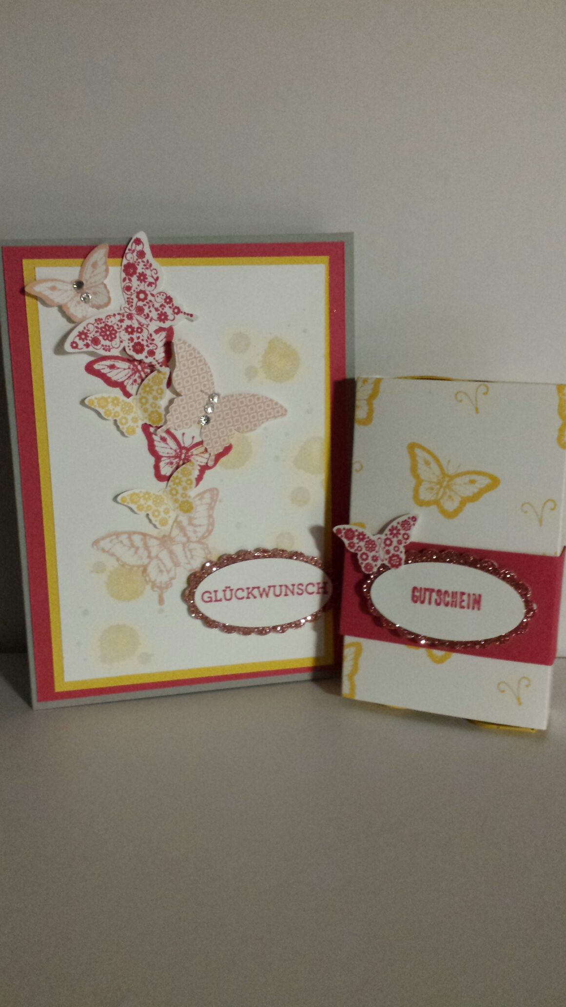 Da die Farben eher für einen Mann sind, bastelte ich sofort eine Gutscheinverpackung für eine Frau. Dazu kam dann noch die passende Karte. Schaut selbst: