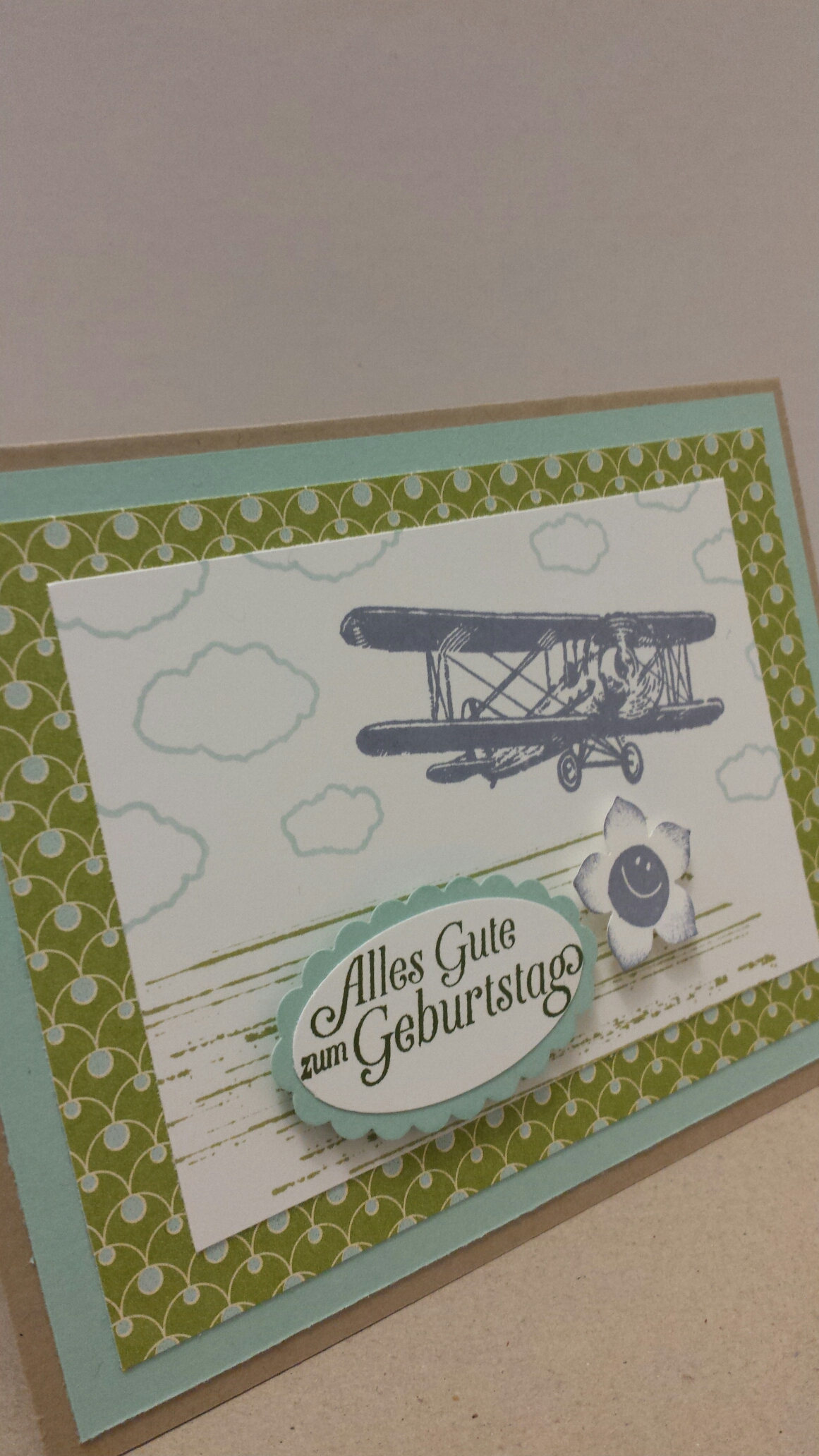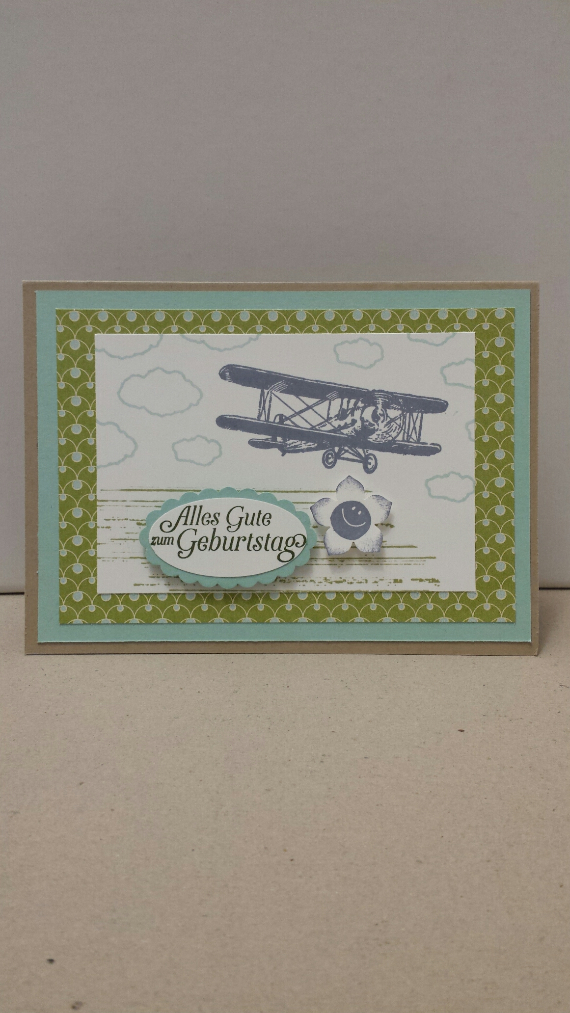 Eigentlich wollte ich die Karte nur mit dem Stempelset „Hoch hinaus“ gestalten. Ich finde das Flugzeug als Motiv interessant. Allerdings kam mir die Karte etwas kahl vor. Deshalb nahm ich noch einen Hintergrundstempel aus dem Stempelset „Gorgeous Grunge“ und den Smilie aus den Stempelset „Hallo“. Ich liebe diesen Smilie, aber das habt ihr bestimmt schon gemerkt ;).