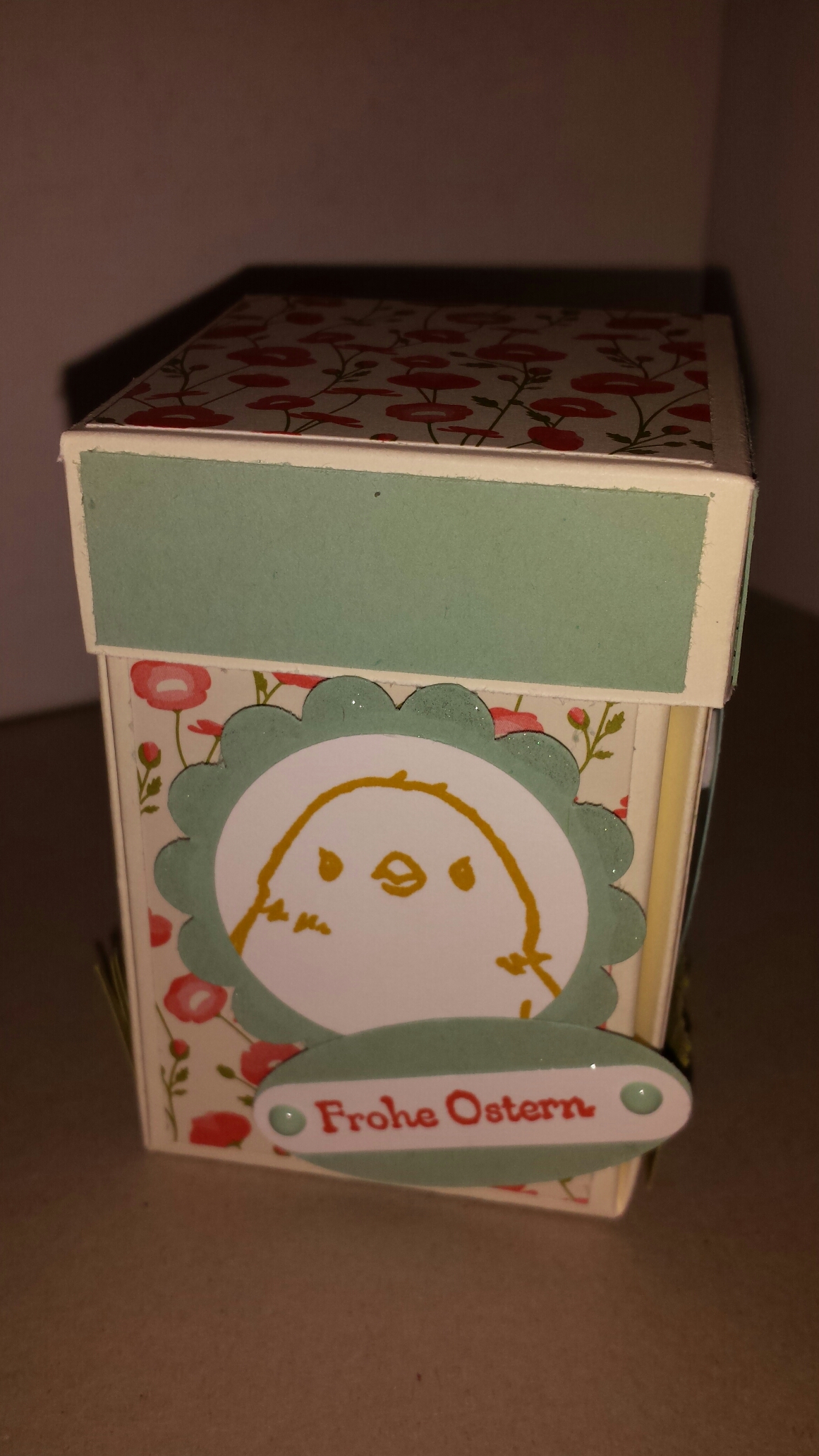 Für die österliche Box habe zusätzlich die Farben Aquamarin, Osterglocke, Wassermelone und Farngrün eingesetzt und hieraus mit der Stanze Großes Oval Ostereier gestanzt bzw. das Gras geschnitten. Da ich das Blumendekor als Grundlage gewählt habe, sieht es doch aus, als lägen die Eier auf einer blühenden Wiese. Findet ihr nicht? Und was passt zu Eiern und Wiese? Richtig, das Küken aus dem Stempelset “ So Süß“ aus der diesjährigen Sale-A-Bration.