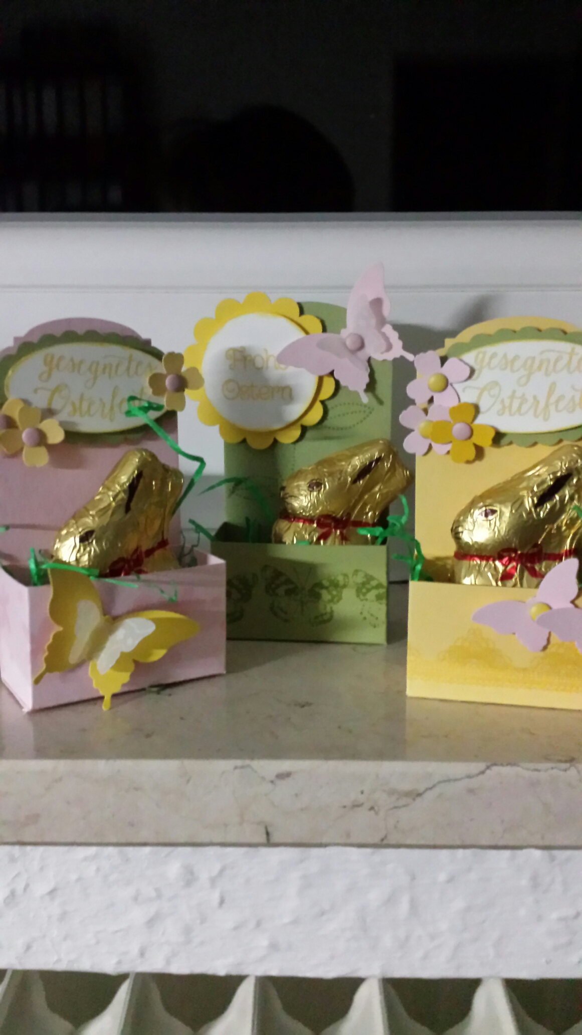Ihr seht, ich habe die kleinen Osternester in den Farben Safrangelb, Farngrün und Zartrosa gehalten und jeweils anders dekoriert. Der Spruch „gesegnetes Osterfest“ ist Teil eines Stempels des Stempelsets “ Wunderbare Worte“. Den Spruch “ Frohe Ostern“ habe ich dem Stempelset „Frühlingsreigen“ entnommen. Dann nur noch Schmetterlinge und Blumen ausstanzen und verteilen. Fertig.