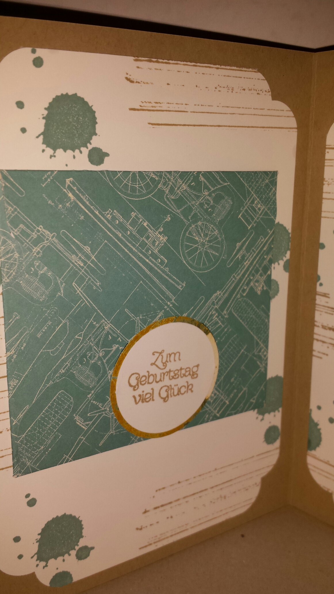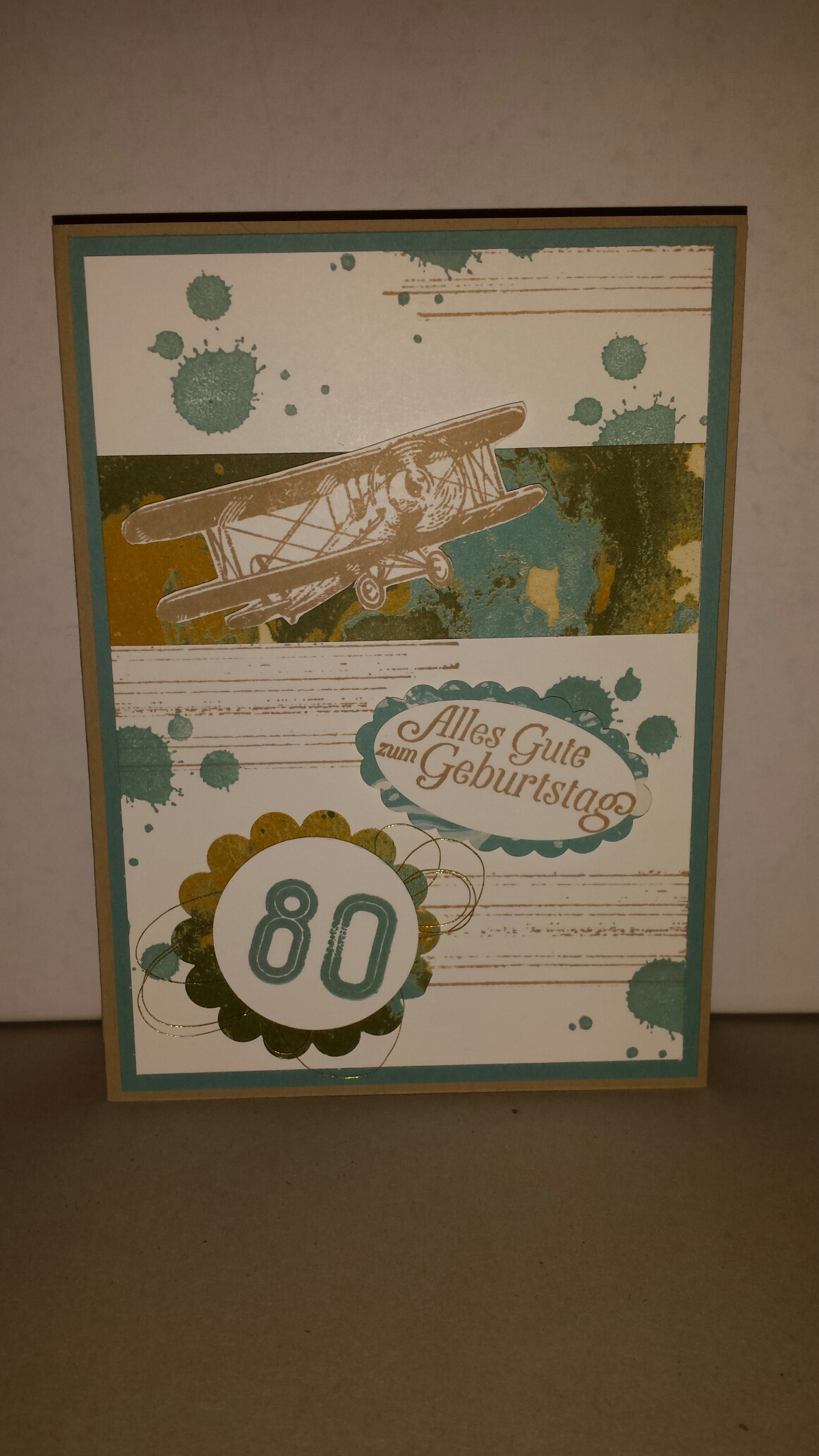 Wie ihr seht, habe ich als Grundkarte Savanne gewählt und nur noch eine weitere Farbe, nämlich Lagunenblau, genutzt. Den Hintergrund habe ich mit dem Stempelset „Gorgeous Grunge “ gestaltet. Das Flugzeug und der Spruch sind aus dem Stempelset „Hoch hinaus“, dass man während der Sale-A-Bration gratis bestellen konnte. Die 80zig habe ich wieder mit dem Stempelset „Birthday Yay“ gestempelt. Als Designerpapier kam „Weite Welt“ zum Einsatz. Dann noch ein paar Goldfäden und fertig war die Außengestaltung. Innen habe ich folgendes gemacht: