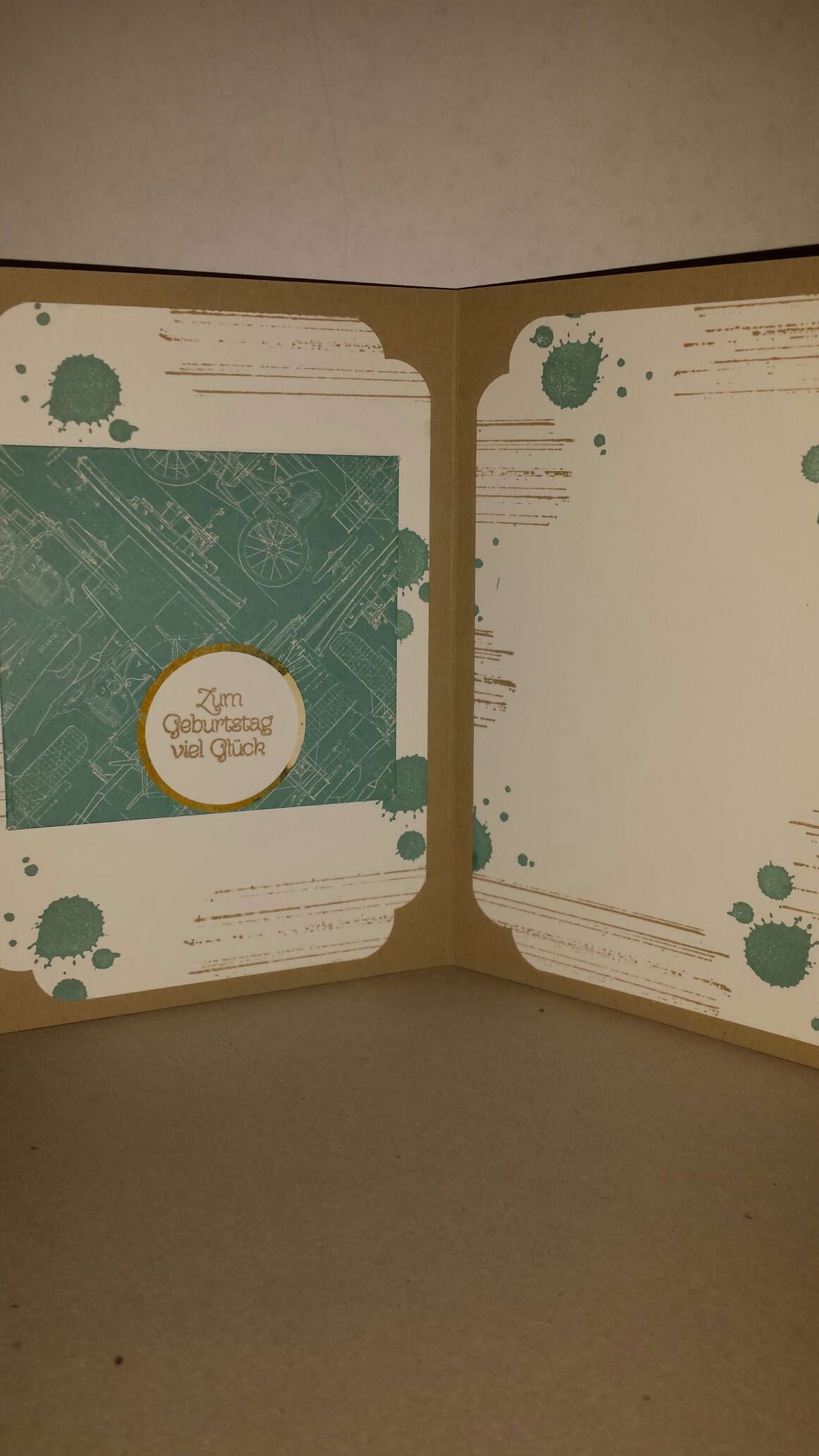 Wir möchten dem Lebensgefährten einen kleinen Obolus schenken. Deshalb habe ich aus dem Designerpapier „Weite Welt“ einen kleinen Umschlag gestaltet. Damit der Hintergrund für den Umschlag nicht zu nackt ist, habe ich die Außengestaltung innen übernommen. Diesmal habe ich aber mit der Stanze Trio-Stanze Elegante Ecken aus dem Frühjahr / Sommerkatalog 2016 von stampin up die Ecken gefällig gestaltet.