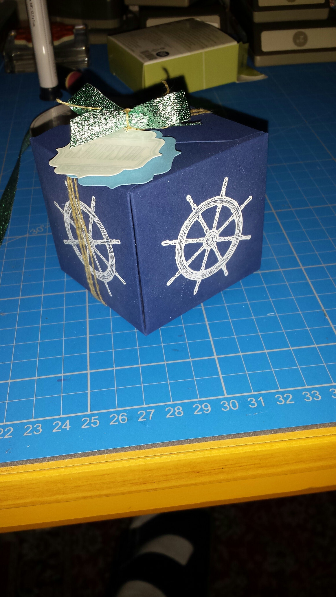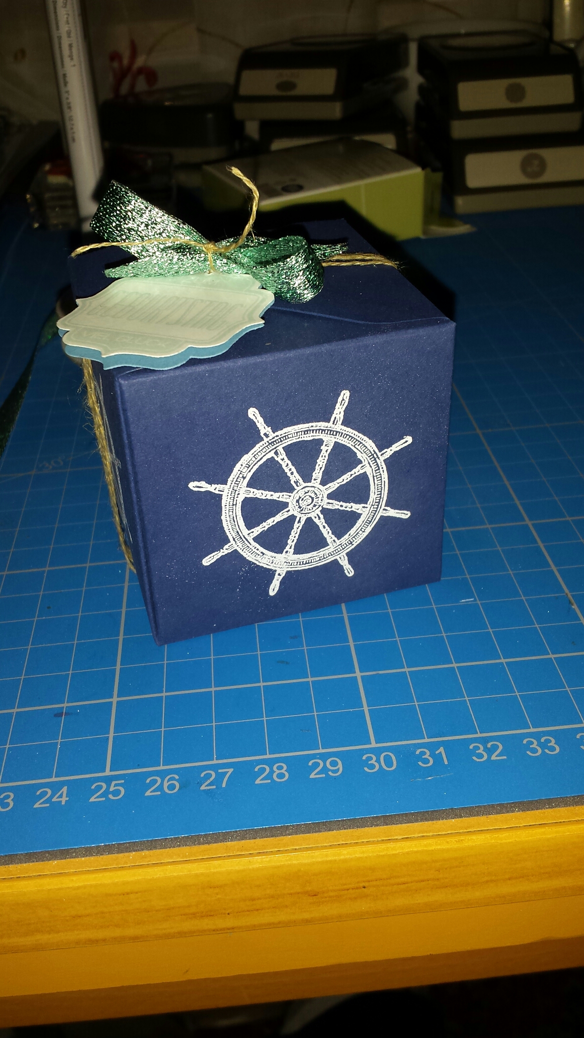 Ich habe am Wochenende, passend zur Glückwunschkarte mit dem Schiff, eine kleine Box gestaltet. Als Grundlage habe ich den Cardstock Marineblau genutzt. Passend zum Schiff habe ich das Steuerrad aus dem Stempelset „Vom Land aufs Meer“ weiß embossed. Noch ein Etikett in Himmelblau, hinterlegt mit Cardstock Himmelblau, und Leinenfaden. Dann noch Glitzerband in Aquamarin und fertig ist die Box.
