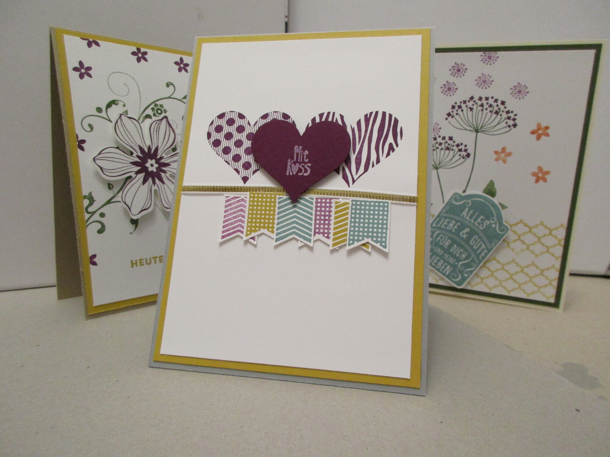 Heute zeige ich euch Grußkarten in den scheidenden In-Colour-Farbe, gemacht mit Stempelsets und Stanzen, die ebenfalls nur noch bis zum 31.05.2016 käuflich erworben werden können. Ich habe die „Zierblume“  (Stempel und Stanze), das Stempelset „flowering flourishes“, das Stempelset „Herzklopfen, dad Stempelset „Sommer Silhoutte“, „Passend zum Etikett“ (Stempel und Stanze) und das Set „sags mit Fähnchen“  (Stempel und Stanze) genutzt.