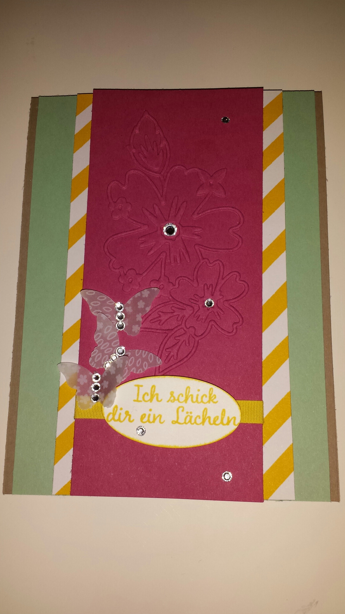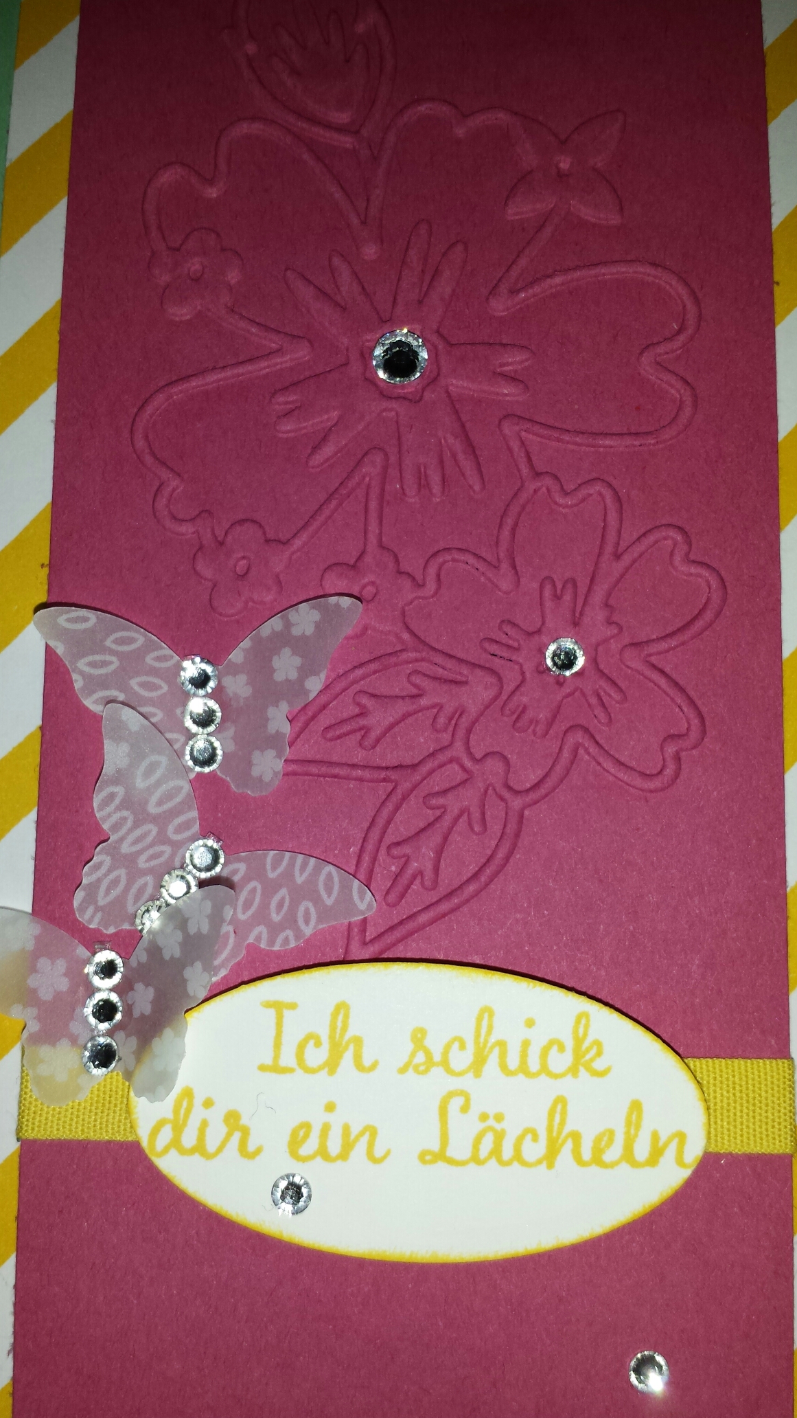 Noch ein paar Schmetterlinge aus Pergamentpapier nebst Straßsteinchen und fertig ist eine schnell herzustellen Karte.