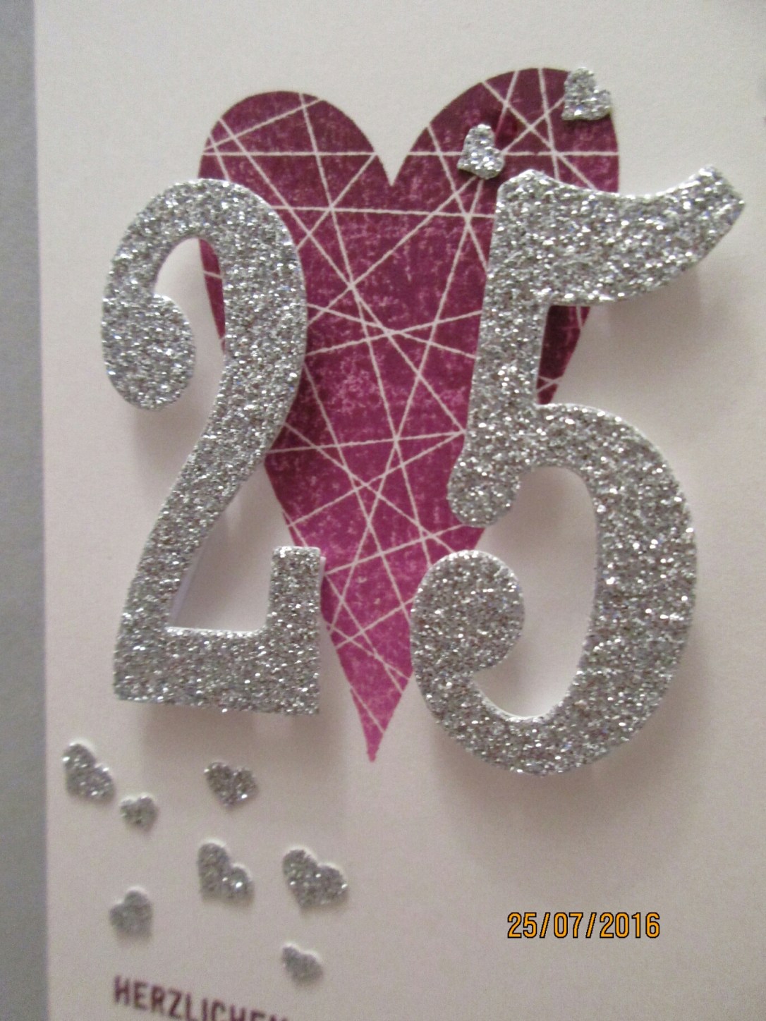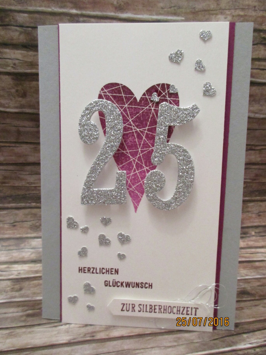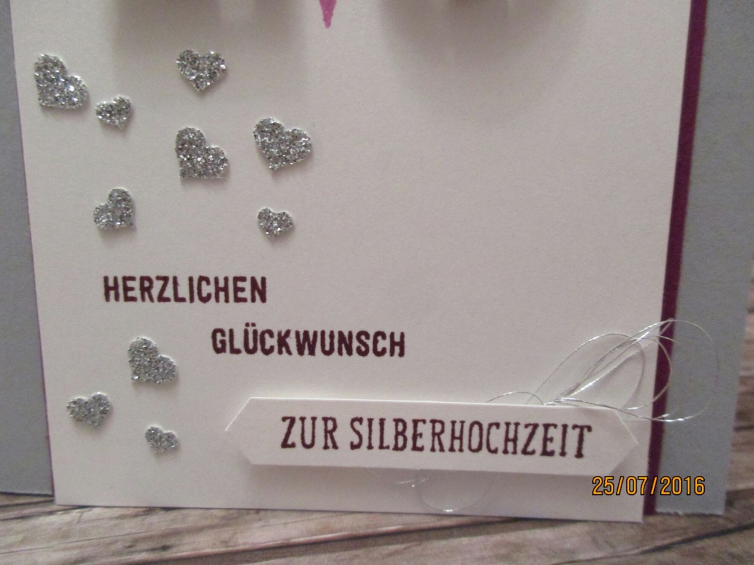 Heute möchte ich euch eine Glückwunschkarte zur Silberhochzeit zeigen, die eine Freundin von mir benötigte. Da ich sie in einer recht kurzen Zeit fertigen musste und ich mein Stempelkissen in Schiefergrau verliehen hatte, musste als Alternative eine andere Farbe her. Ich habe mich für Himbeerrot entschieden. Dazu Glitzerkarton in Silber. Das war meine Grundlage. Und so sieht das Ergebnis aus: