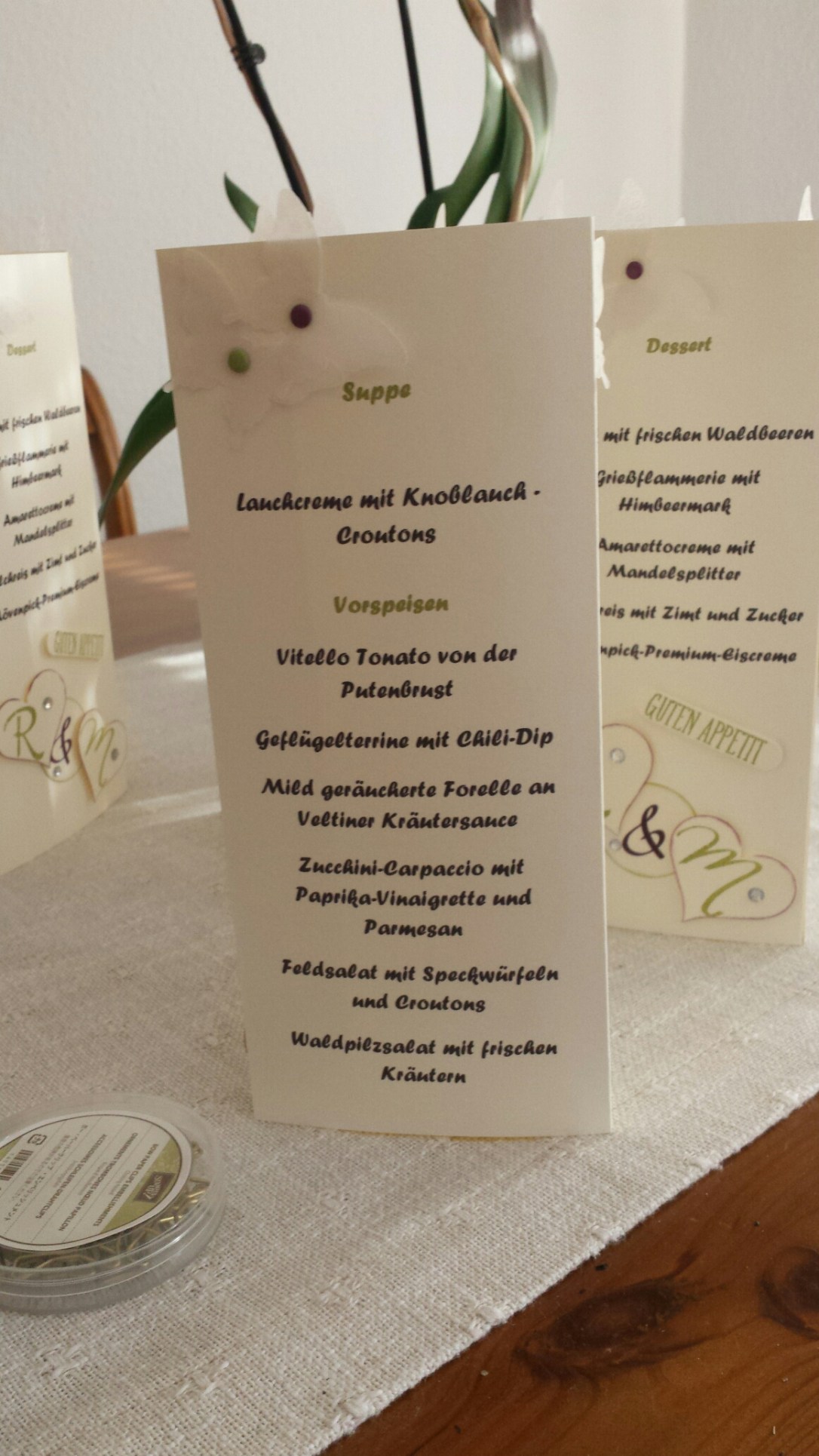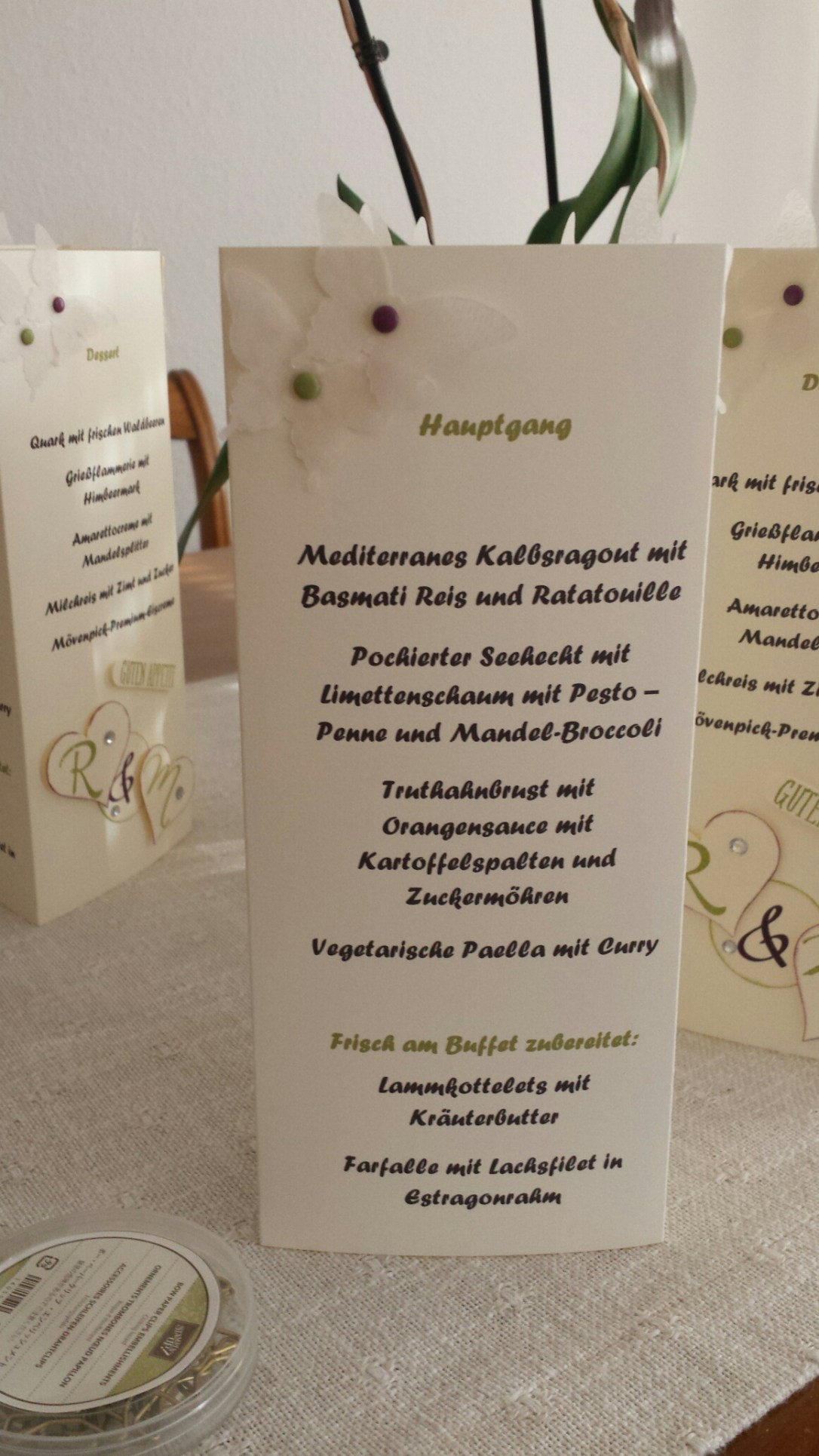 Als erstes zeige ich euch eine „Menükarte“ , die aber eine „Buffetkarte“ ist. Wie gestaltet man eine Buffetkarte? Eigentlich ganz einfach. Man bedruckt den Cardstock, falzt drei Bereiche und dekoriert. Nur das verteilen der Hänge könnte je nach Länge etwas komplizierter werden.