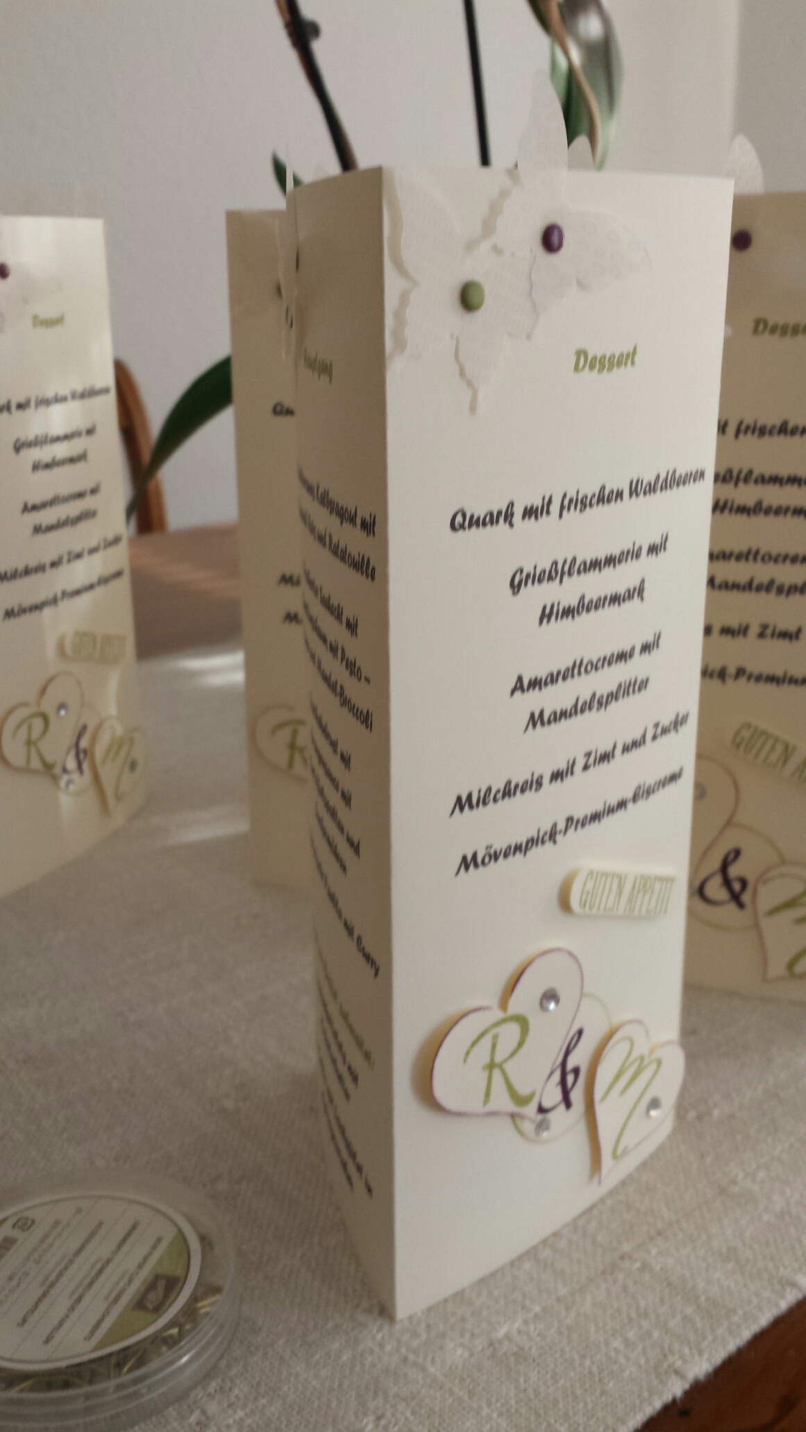 Als erstes zeige ich euch eine „Menükarte“ , die aber eine „Buffetkarte“ ist. Wie gestaltet man eine Buffetkarte? Eigentlich ganz einfach. Man bedruckt den Cardstock, falzt drei Bereiche und dekoriert. Nur das verteilen der Hänge könnte je nach Länge etwas komplizierter werden.