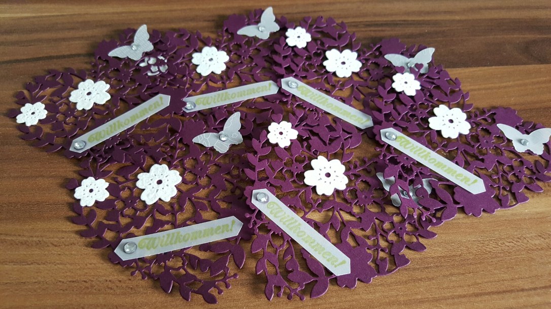 Nun zeige ich euch noch ein Teil der geplanten Tischdekoration. Erstellt habe ich diese mit den Thinlits „blühendes Herz“, dem alten Stempelset „Eins für alles“, den Stanzen „Schmetterling“ und „klassisches Etikett“. Farblich wurde wieder Farngrün, Brombeermouse, weißer Glitzerkarton und Pergamentpapier.