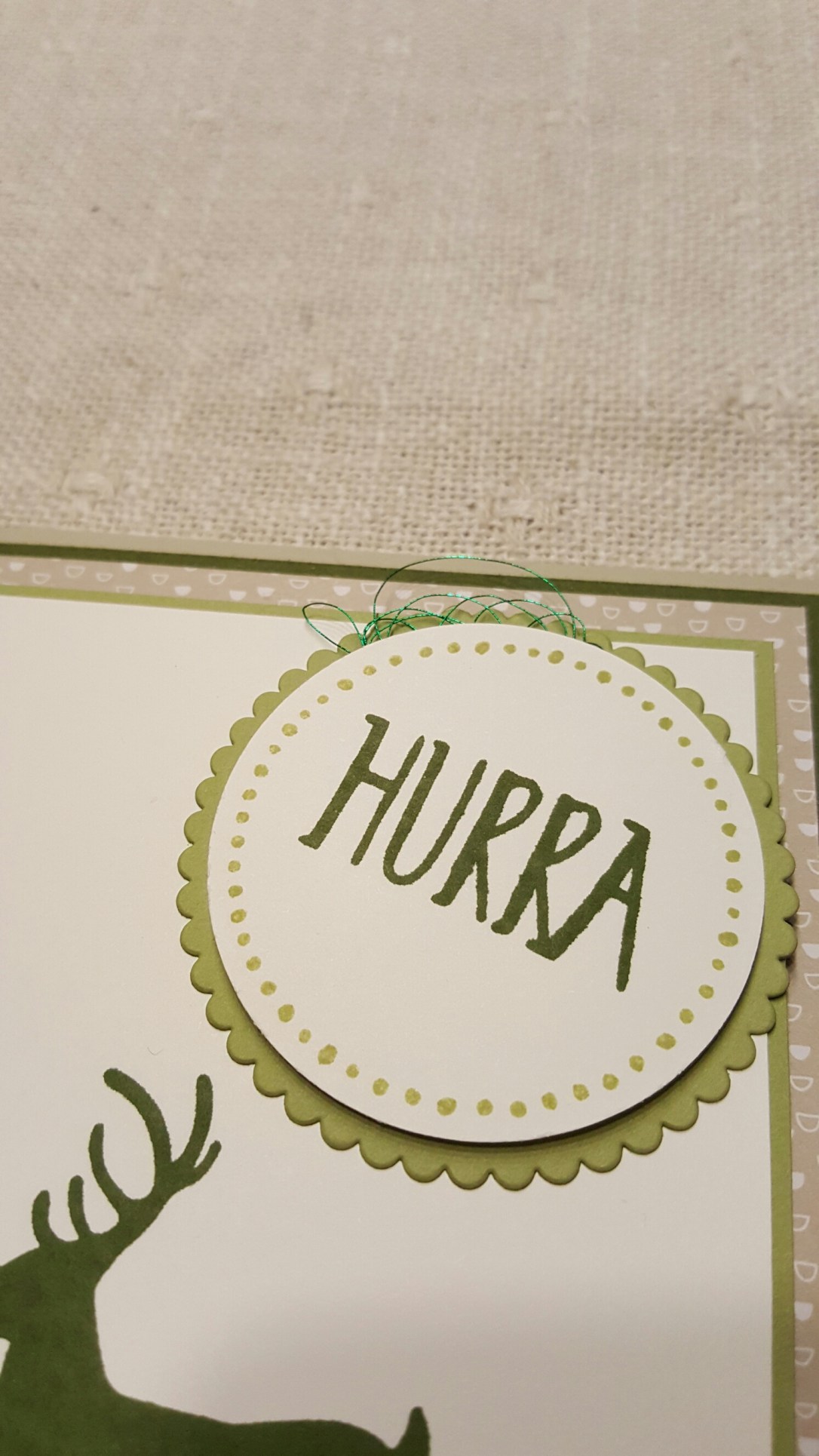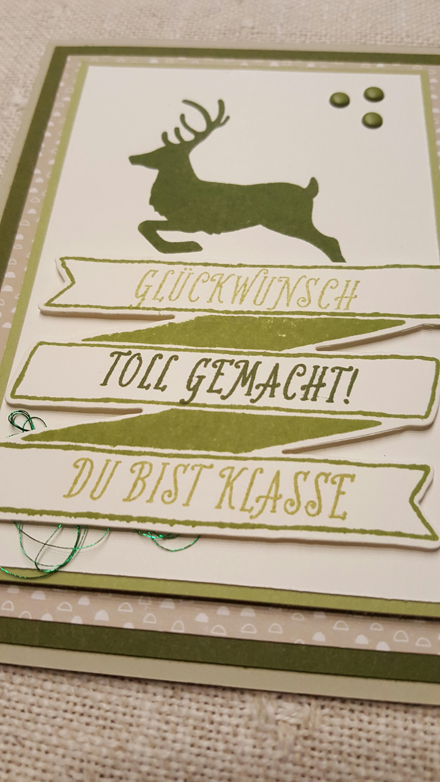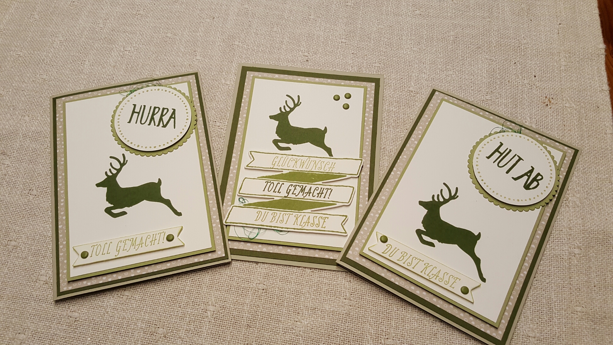 Bei allen drei habe ich den springenden Hirsch als Grundmotiv genutzt. Ergänzt wurde das Motiv bei zwei Karten mit Sprüchen aus dem Stempelset „Perfekt verpackt“, ausgestanzt mit der 2″-Kreisstanze, unterlegt mit dem passenden Wellenkreis auf dem Set „lagenweise Kreise“, geschmückt mit Metallic Garn in Smaragdgrün. Zusätzlich habe ich einen Spruch aus dem Stempelset „Bannereien“ gestempelt und mit dem passenden Framelits aus dem Set „Bannermix“ ausgestanzte. Diesen habe ich geinkt und mit – nicht mehr erhältlichen – süßen Pünktchen in Grün geschmückt.