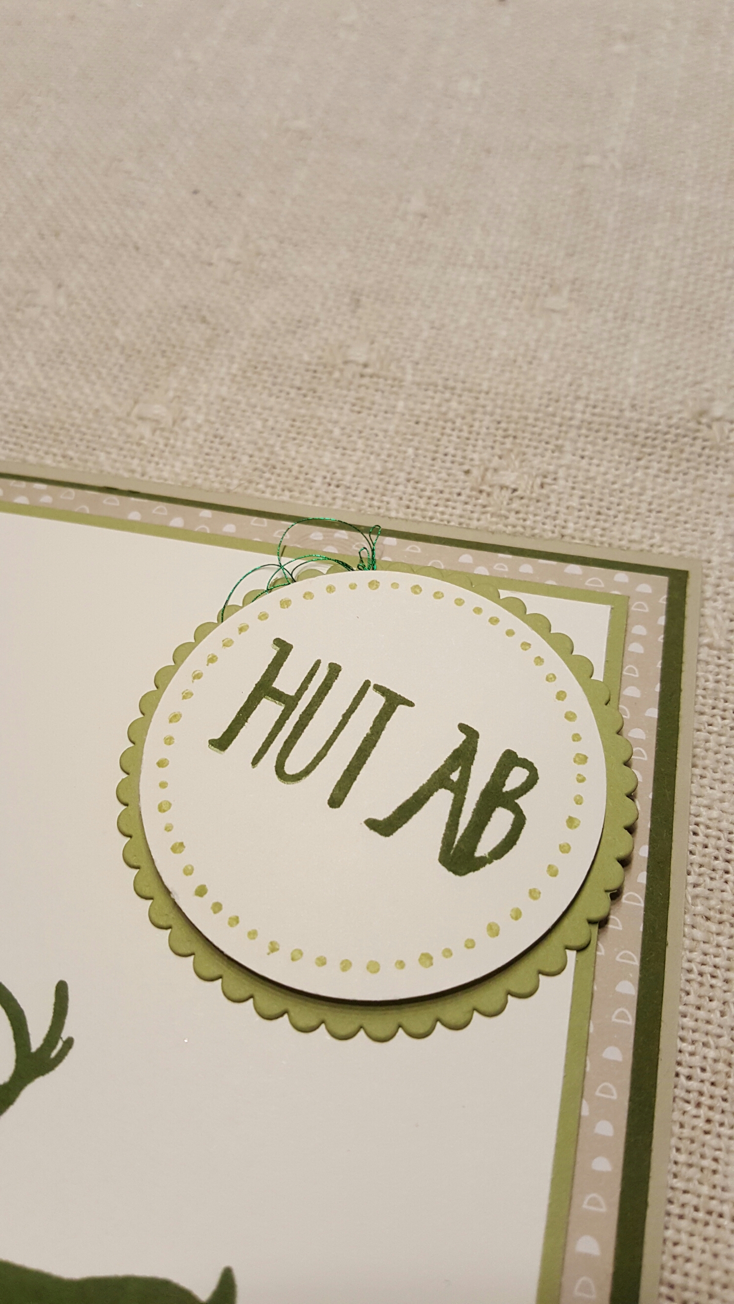 Farblich habe ich mich passend zum Thema „Schützen“ in grün ausgelobt. Und auch hier kamen einen alte Farbe – nämlich Waldmeister – und ein Reste vom Designerpapier „meine Party“ in Saharasand zum Einsatz. Ergänzt habe ich meine Karten mit den Farben Farngrün und teilweise olivgrün.