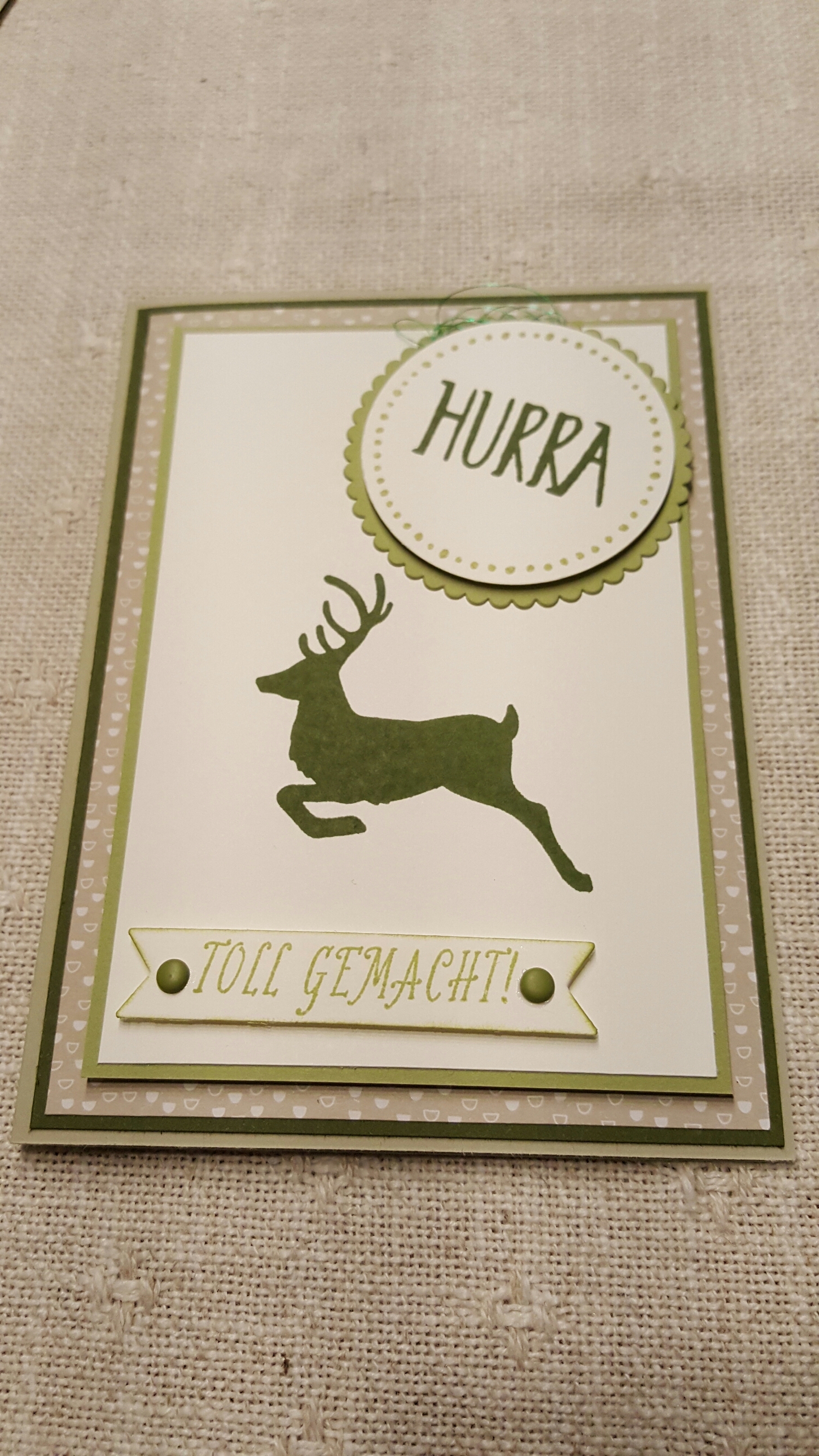 Drei Karten sind schon fertig. Und in einem alten Weihnachtsstempelset fand ich ein sehr passendes Motiv: einen springenden Hirsch. Das Stempelset heißt „Wahre Wrihnachtsfreuden“. Leider kann man es bei stampin up nicht mehr käuflich erwerben.