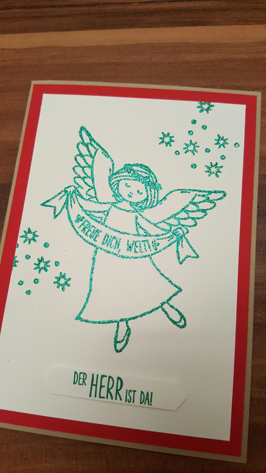 Bei der zweiten Variante habe ich den Engel in Gold embossed. Den Spruch habe ich statt dessen in Glutrot gestempelt.
