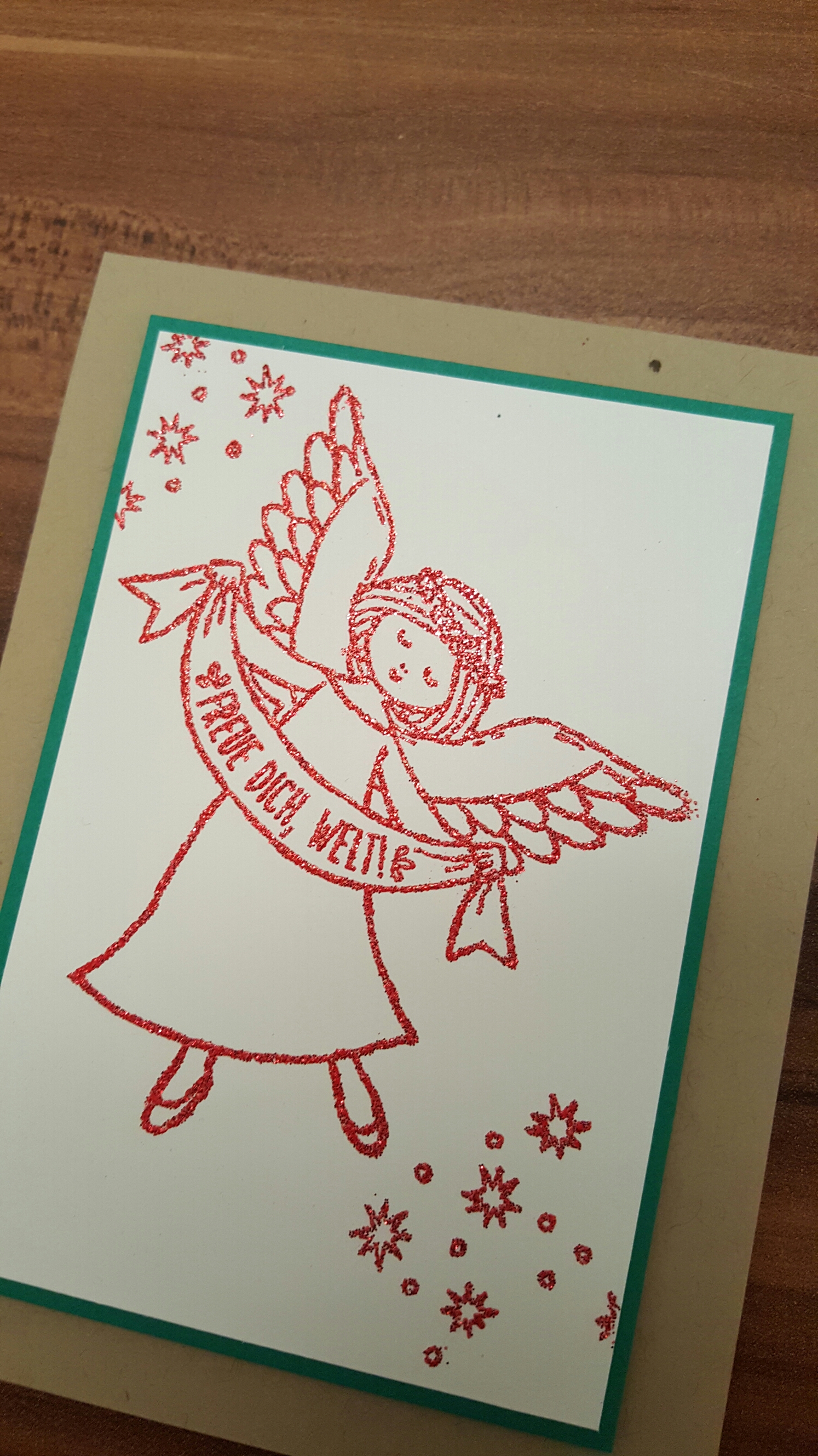 Bei der dritten Variante habe ich den Engel mit dem neuen Glitzerprägepulver in Glutrot embossed.