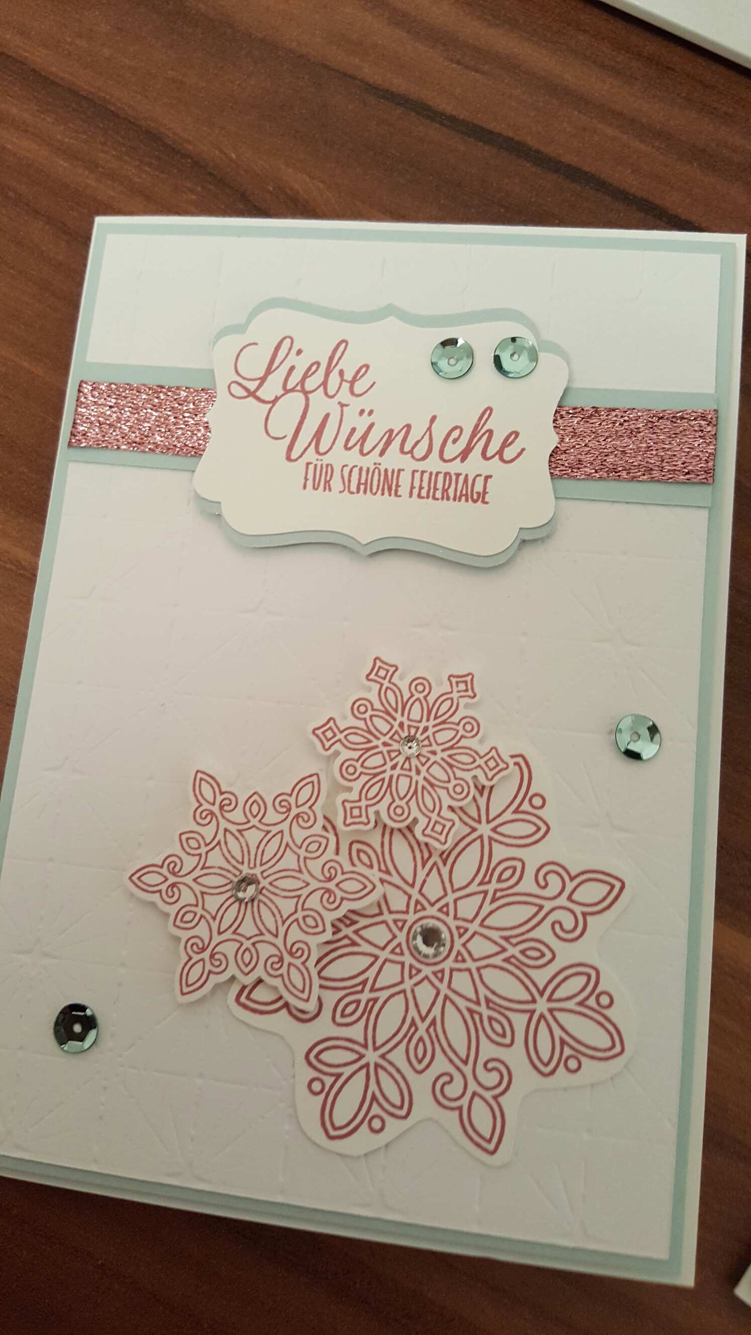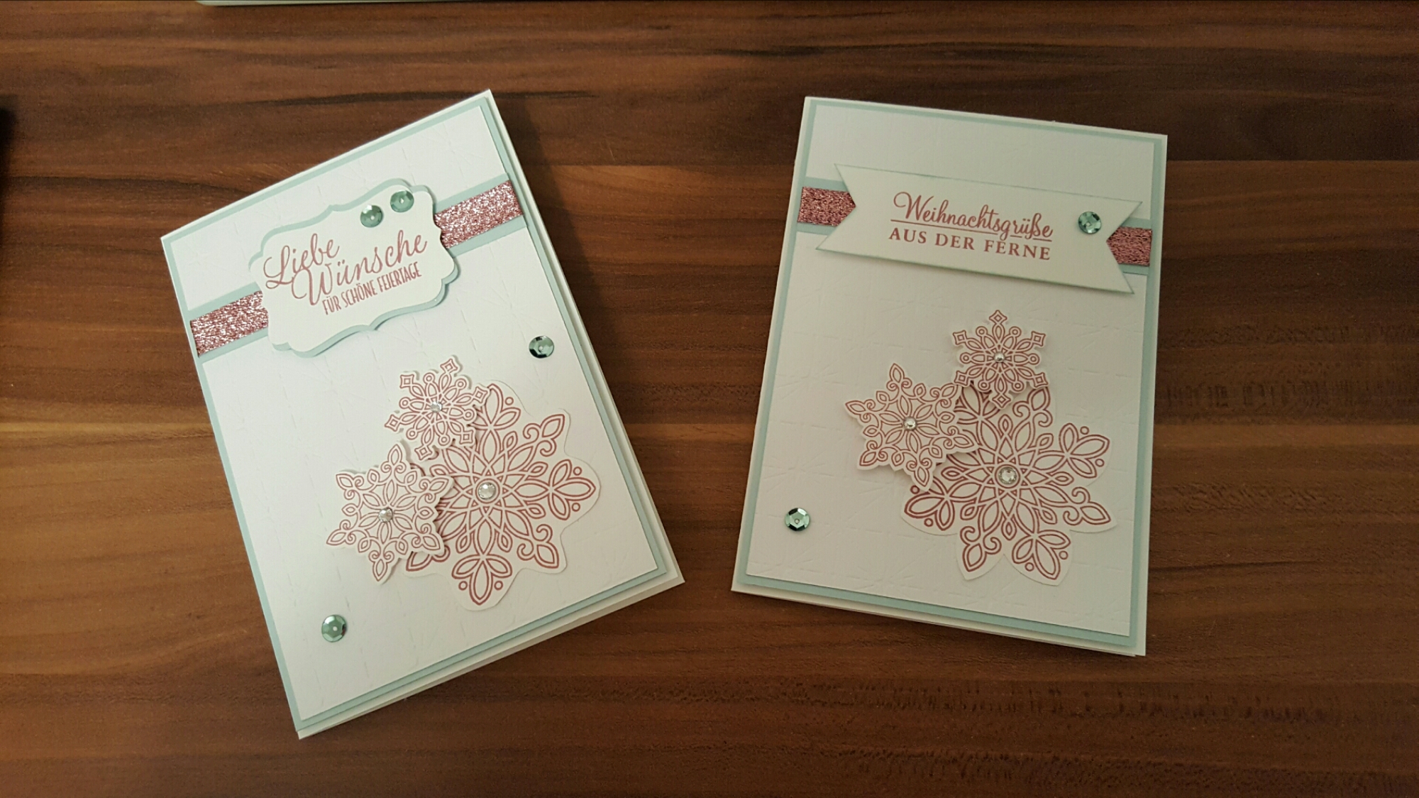 Dieses Mal habe ich das Stempelset „Flockenzauber“ nebst passender Handstanze für die kleinen Flocken genutzt. Die große Flockenzauber habe ich mit der Handstanze „Blütenmedaillion“ ausgestanzt. Das geht sehr gut.