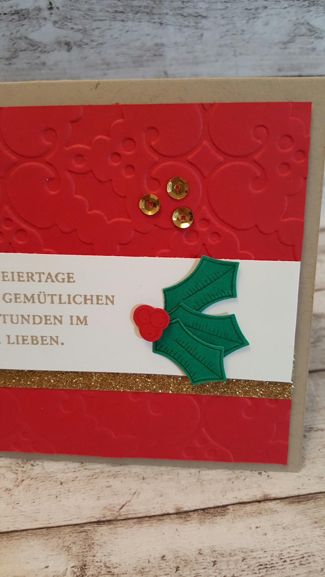 Den Ilex habe ich in Smaragdgrün auf Cardstock in Smaragdgrün gestempelt und ausgestanzt. Die Frucht natürlich in Cardstock Glutrot.