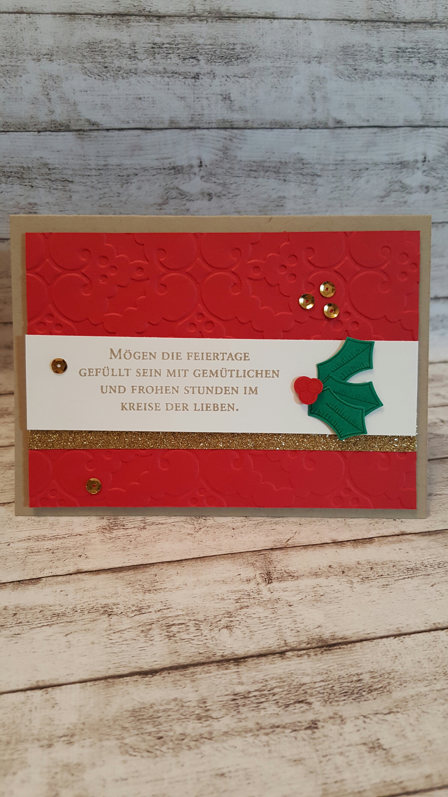 Gestern hatte ich noch ein Stück Cardstock in Glutrot übrig und dachte mir: „Den musst du heute noch verarbeiten“. Da fiel mir der Prägefolder „Weihnachtlich unrahmt“ von stampin up ins Auge, den ich noch gar nicht ausprobiert habe. Das musste ich ändern. Das seht ihr doch auch so, oder?