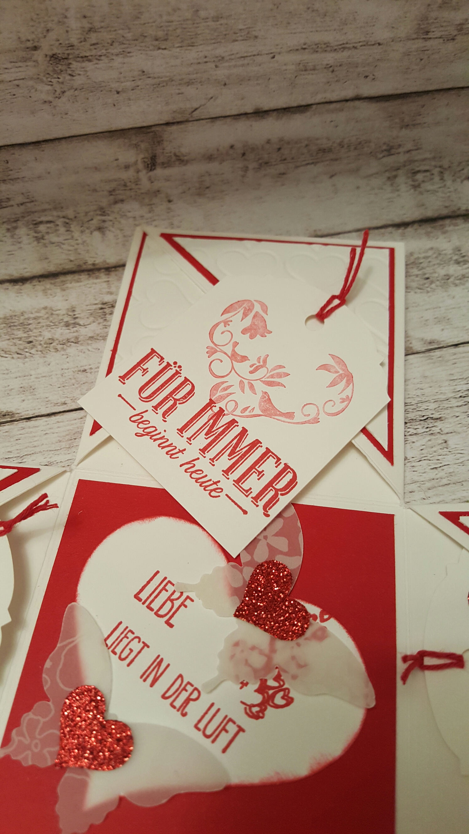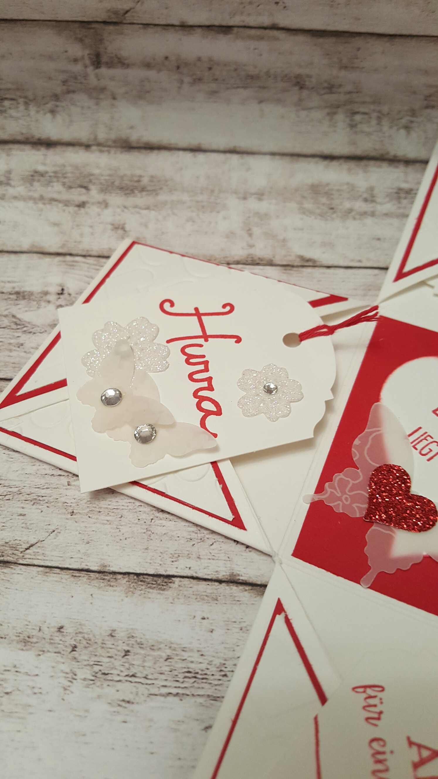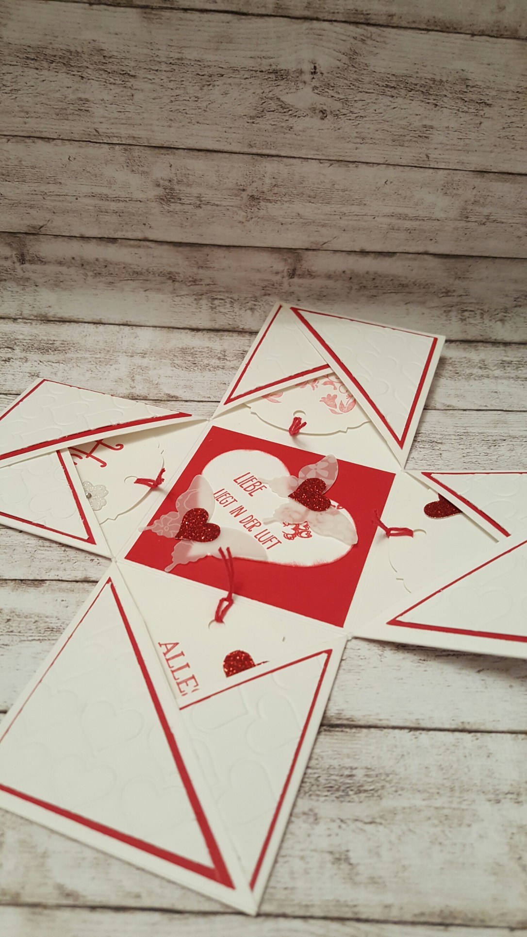 Der Sohn einer Freundin heiratet. Und welche Farben wählt ein echter Kölscher für seine Hochzeitspapeterie und Dekoration aus? Richtig! Rut – Wien, also Rot-Weiß. Deshalb zeige ich euch jetzt eine Explosionsbox, die als Farben „nur“ Glutrot mit ein bisschen Chili und Flüsterweiß enthält. Irgendwie habe ich mir diesmal nicht aufgeschrieben, welche Produkte ich von stampin up genutzt habe. Deshalb lasse ich jetzt einfach die Bilder alleine wirken:
