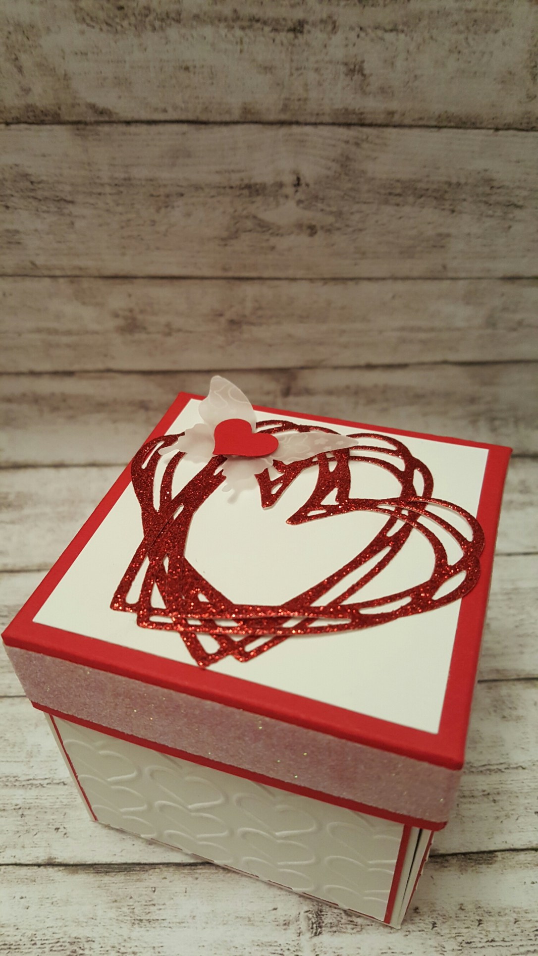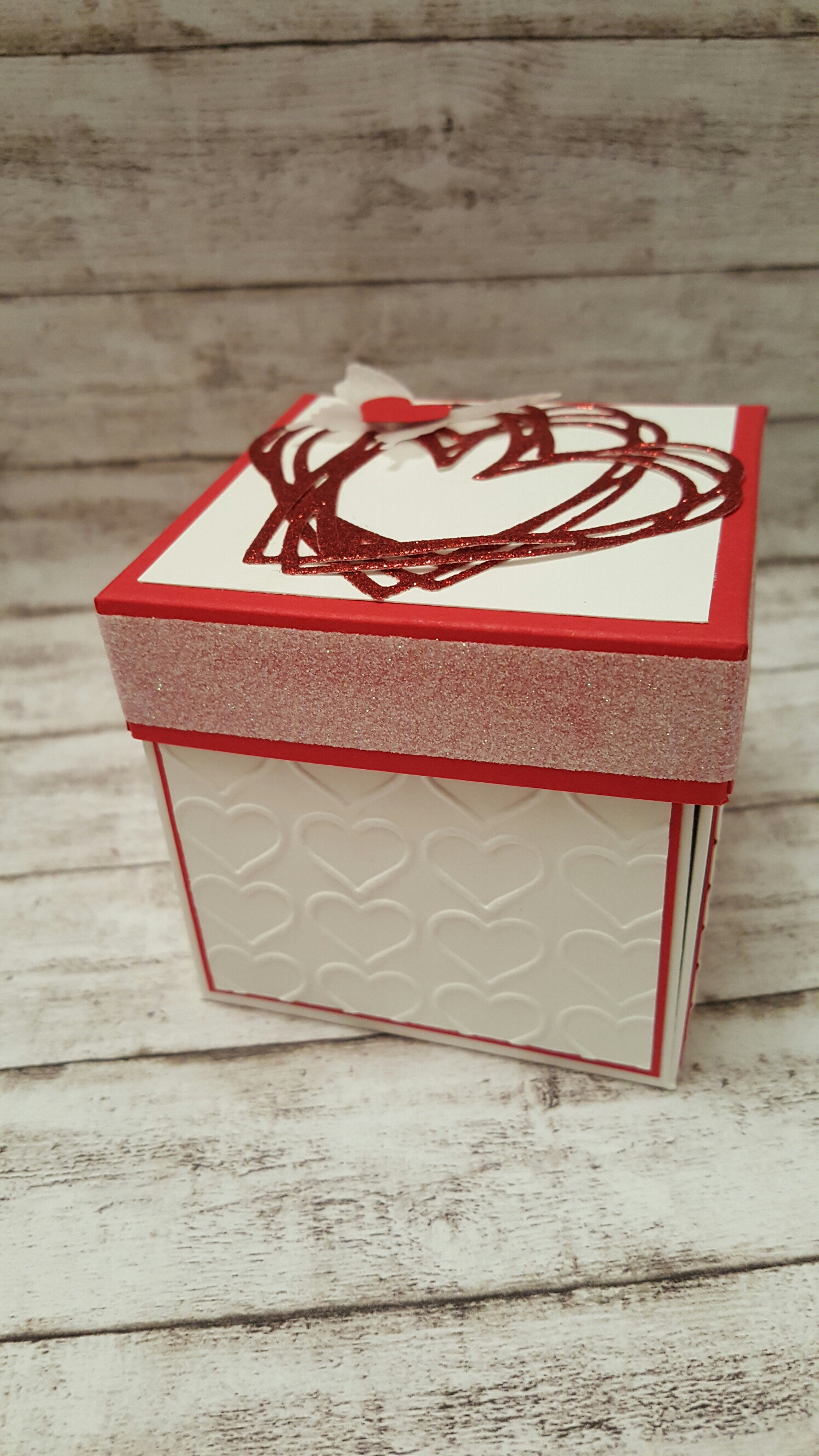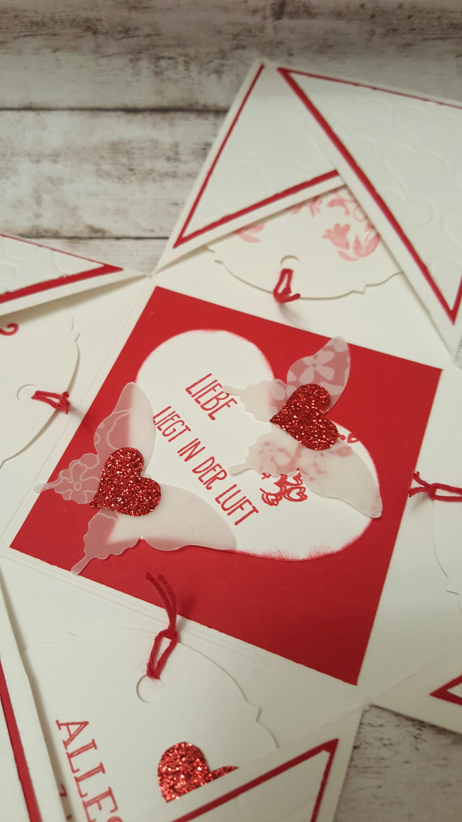 Der Sohn einer Freundin heiratet. Und welche Farben wählt ein echter Kölscher für seine Hochzeitspapeterie und Dekoration aus? Richtig! Rut – Wien, also Rot-Weiß. Deshalb zeige ich euch jetzt eine Explosionsbox, die als Farben „nur“ Glutrot mit ein bisschen Chili und Flüsterweiß enthält. Irgendwie habe ich mir diesmal nicht aufgeschrieben, welche Produkte ich von stampin up genutzt habe. Deshalb lasse ich jetzt einfach die Bilder alleine wirken: