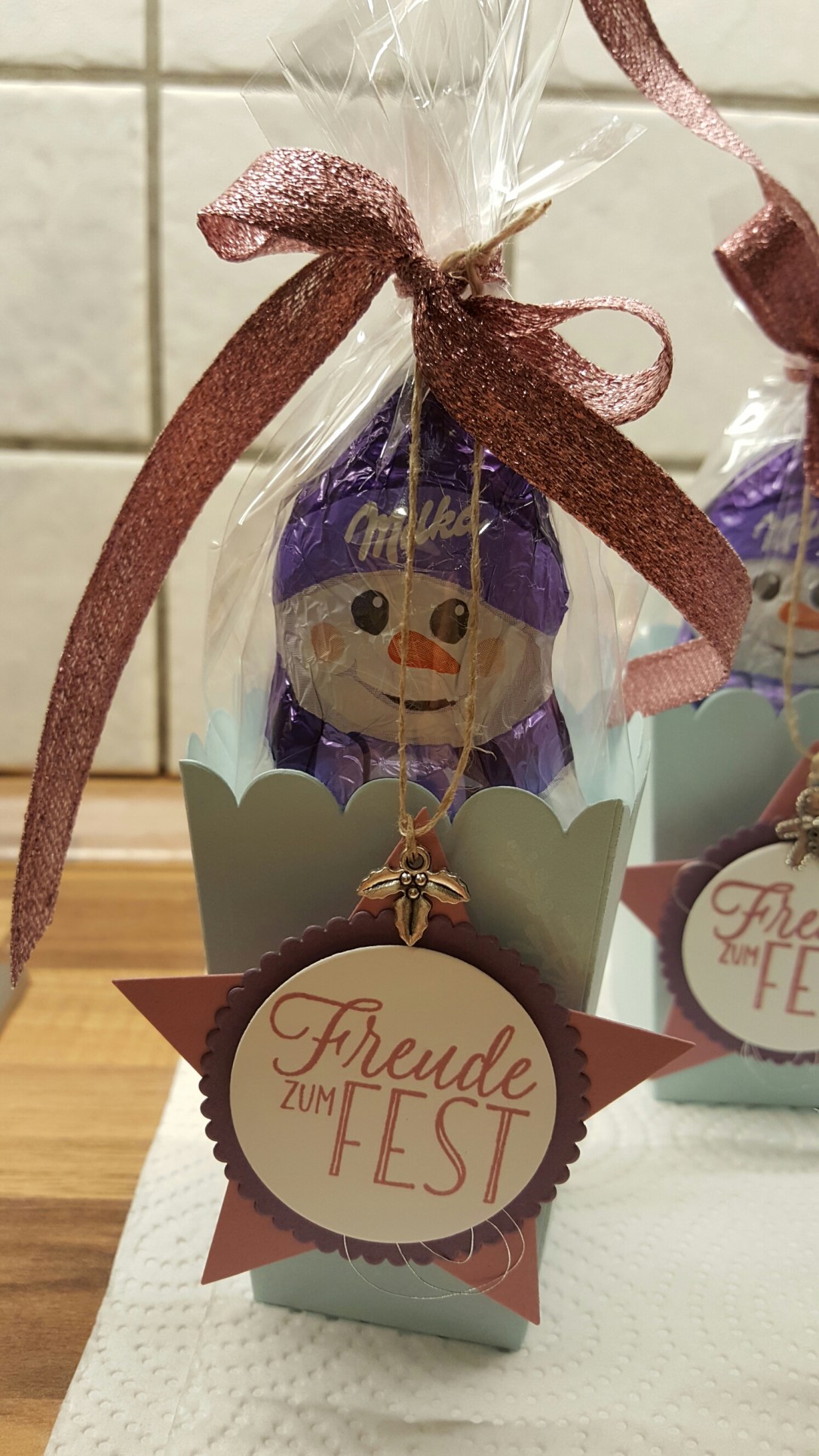 Die Schneemänner haben ihren Weg in die Popcorn Box von stampin up gefunden. Diese habe ich in Himmelblau gefertigt und mit flüsterweiß die Schneeflocke aus dem Stempelset „Drauf und Dran“ bestempelt . Dann wurden sie zum Schutz vor – ach ich weiß nicht was – in Zellophantüten verpackt und mit dem Glitzerband in Zarte Pflaume verschlossen. Dem einen scheint der Wind so richtig um die Ohren zu wehen. Seht ihr, wie das Band weht?