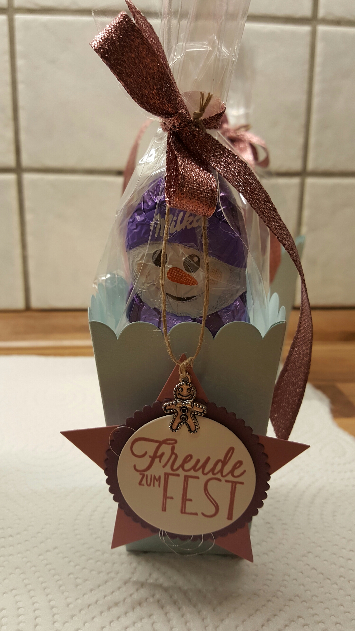 Die Schneemänner haben ihren Weg in die Popcorn Box von stampin up gefunden. Diese habe ich in Himmelblau gefertigt und mit flüsterweiß die Schneeflocke aus dem Stempelset „Drauf und Dran“ bestempelt . Dann wurden sie zum Schutz vor – ach ich weiß nicht was – in Zellophantüten verpackt und mit dem Glitzerband in Zarte Pflaume verschlossen. Dem einen scheint der Wind so richtig um die Ohren zu wehen. Seht ihr, wie das Band weht?