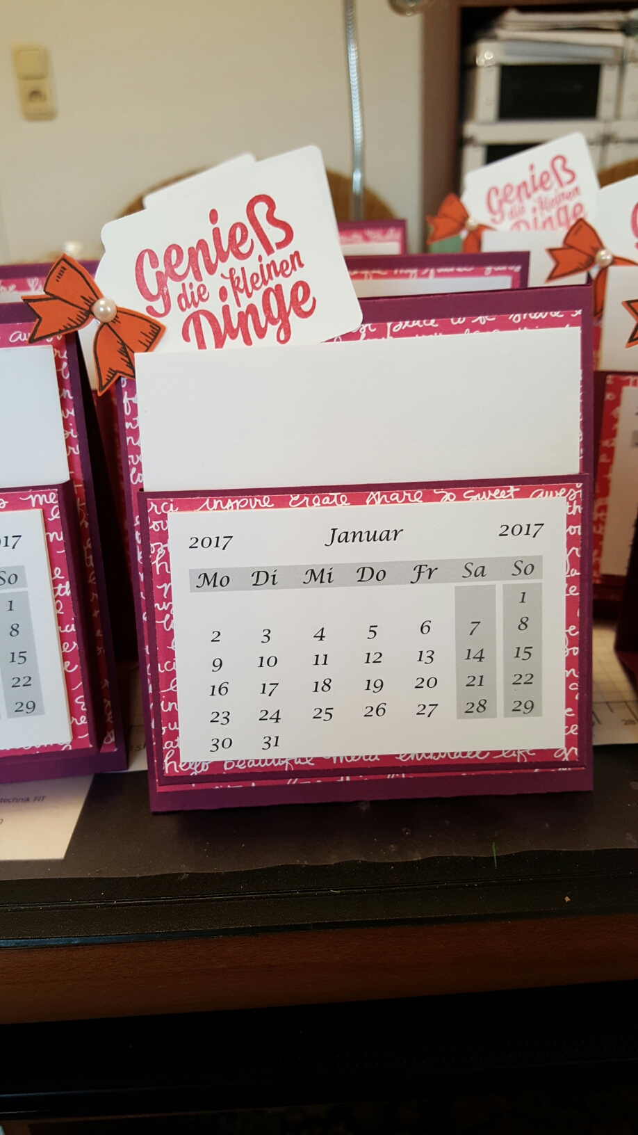 Ich brauchte nach dem “ Bastelstress“ für die Weihnachtsmärkte ehrlich gesagt mal eine kleine Pause. Deshalbzeige ich euch erst jetzt ein kleines Projekt. Ich durfte für Vorstandsdamen der Frauen Union in den Farben der Frauen Union kleine Tischkalender basteln. Die Idee für diesen Tischkalender habe ich von Melanie von Melli’s StempelParadies auf http://www.stempelparadies.bastelblogs.de. Hier nun ein Foto, live (na ja damals war es live) von meinem Basteltisch: