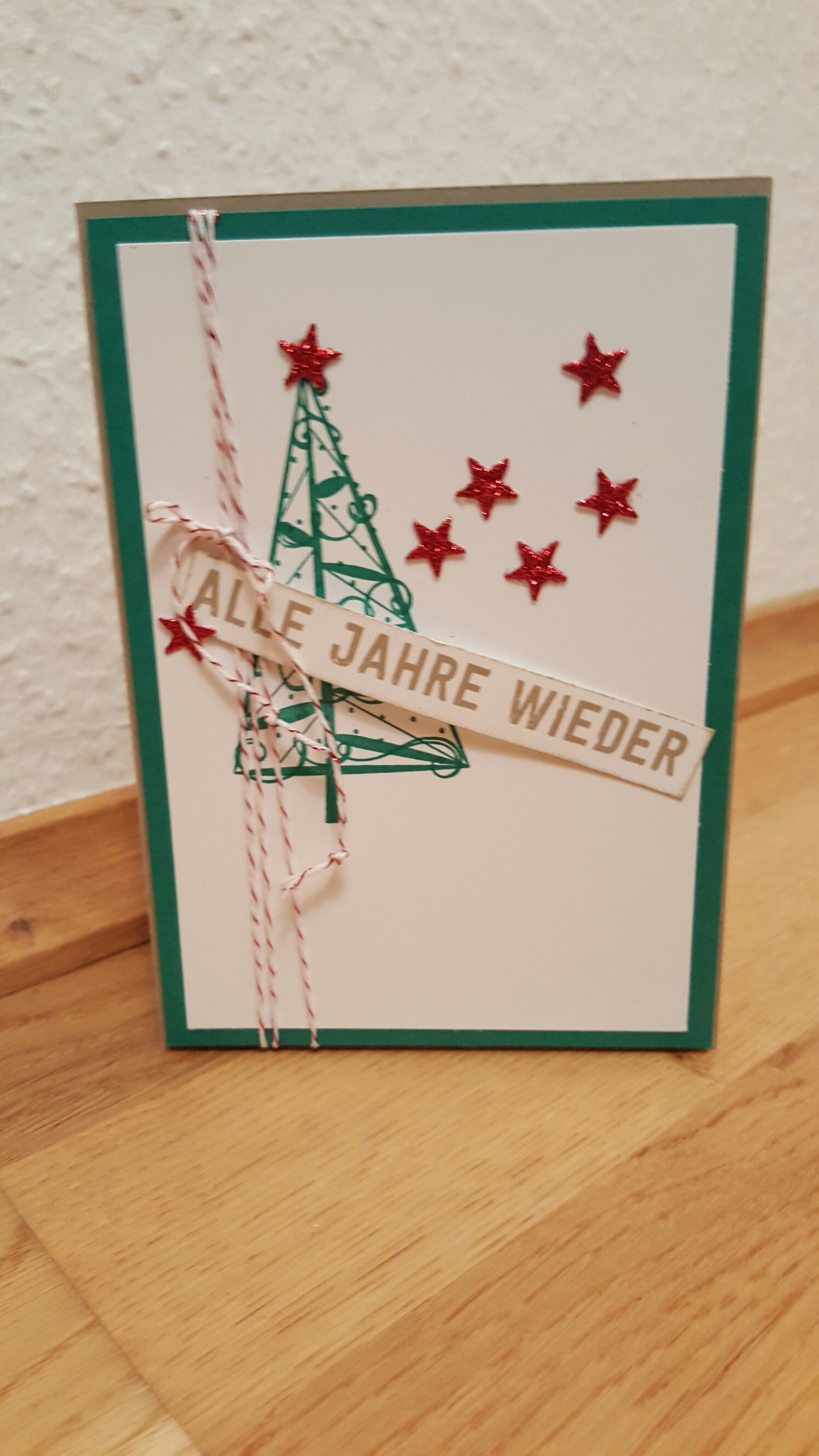 Wie ihr seht, ist es eine sehr cleane Karte. Im Mittelpunkt steht der (moderne) Tannenbaum aus dem Stempelset „Twinkle Trees“ von stampin up, gestempelt in Smaragdgrün. Den Spruch habe ich aus dem Hintergrundstempel „Weihnachtspotpourri“ entnommen, den ich in Savanne gestempelt habe. Noch ein paar Mini-Sterne, die ich mit dem Framelits Formen „Leckereientüte“ aus Glitzerkarton in Glutrot ausgestanzt habe und mit Gluedots befestigt habe.