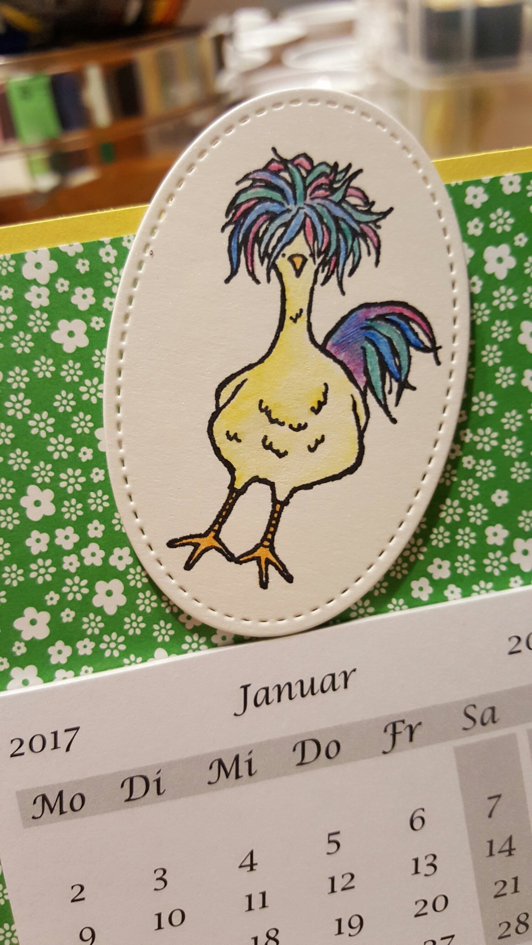 Die Dekoration der zweiten Karte habe ich mit zwei Stempelsets aus der Sale-A-Bration gestaltet. D.h. es sind Stempelsets, die ihr gratis für einen Einkaufswert ab 60 Euro bei stampin up erhaltet. Das Huhn zum Beispiel ist aus dem Stempelset „Das gelbe vom Ei“. Den Spruch findet ihr im Stempelset „Designer T-Shirt“. Das Huhn habe ich übrigens mit den neuen Aquarellstiften colouriert und mit dem Blenderstift verblendet.