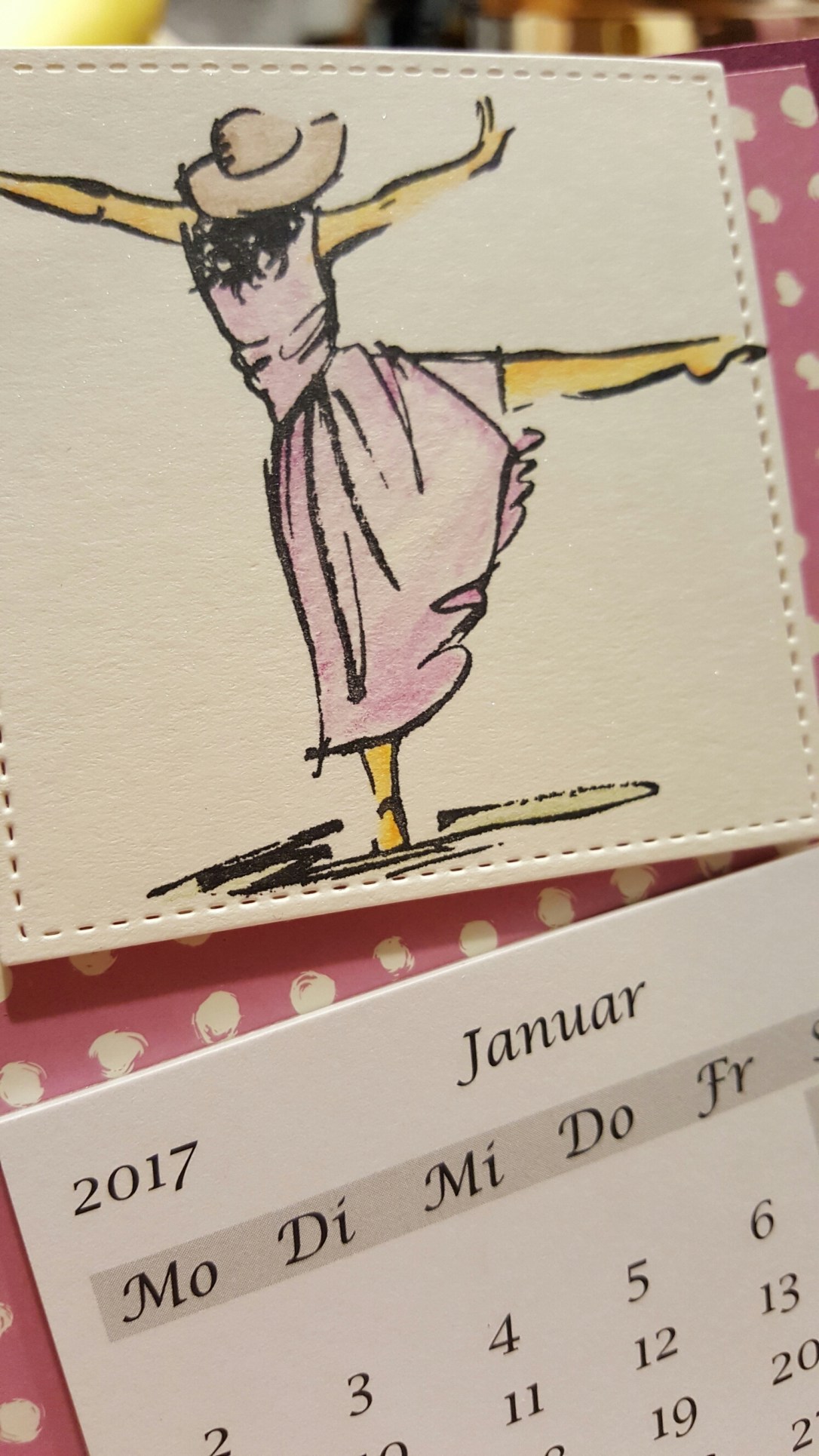Die Dekoration der dritte Variante habe ich mit dem Stempelset „Mit Stil“ gestaltet. Diesmal habe ich die Tänzerin gestempelt, ebenfalls mit den neuen Aquarellstiften colouriert und mit dem Blenderstift verblendet.