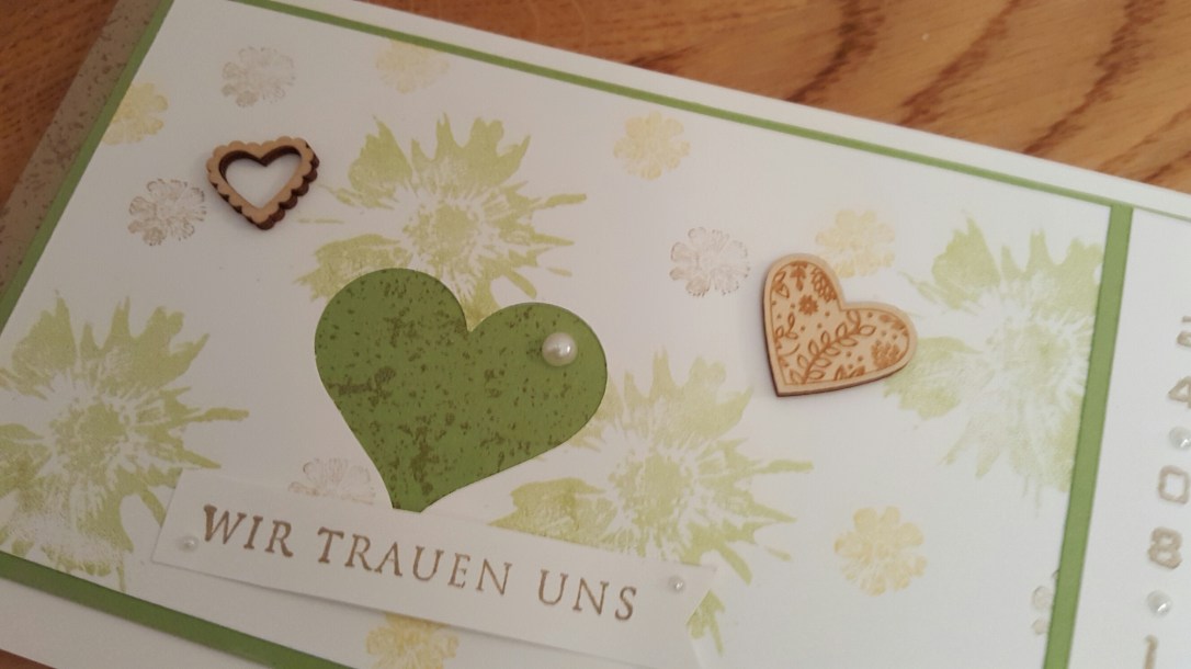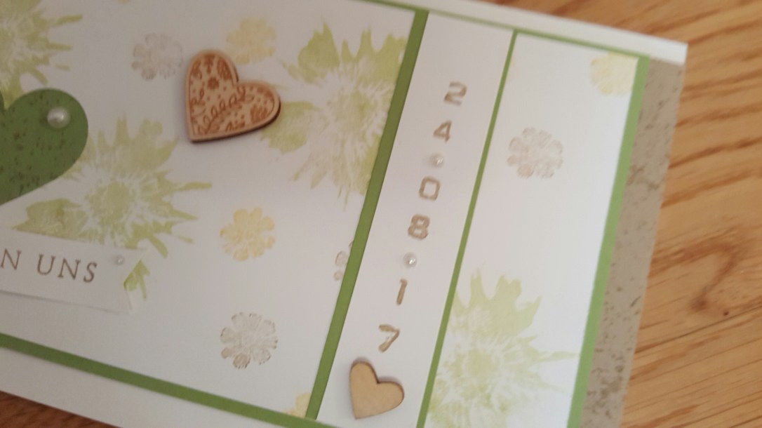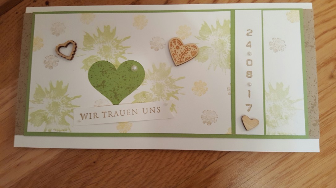 Eine Arbeitskollegin benötigt für ihre Hochzeit Einladungskarten. Sie möchte vorwiegend die Farben grün und weiß, ggf mit etwas beige, für die Gestaltung nutzen. Na ja, bei diesem Entwurf habe ich allerdings noch Safrangelb verwendet.