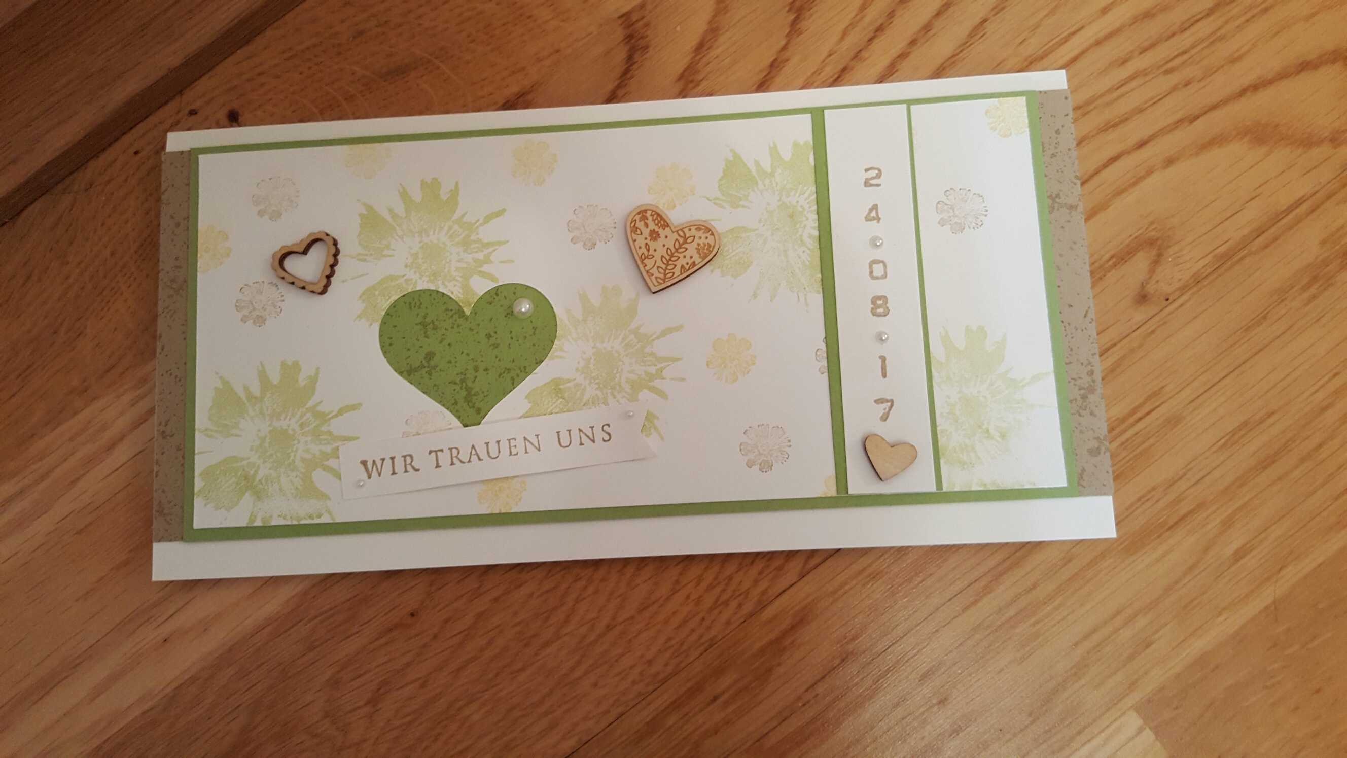 Eine Arbeitskollegin benötigt für ihre Hochzeit Einladungskarten. Sie möchte vorwiegend die Farben grün und weiß, ggf mit etwas beige, für die Gestaltung nutzen. Na ja, bei diesem Entwurf habe ich allerdings noch Safrangelb verwendet.