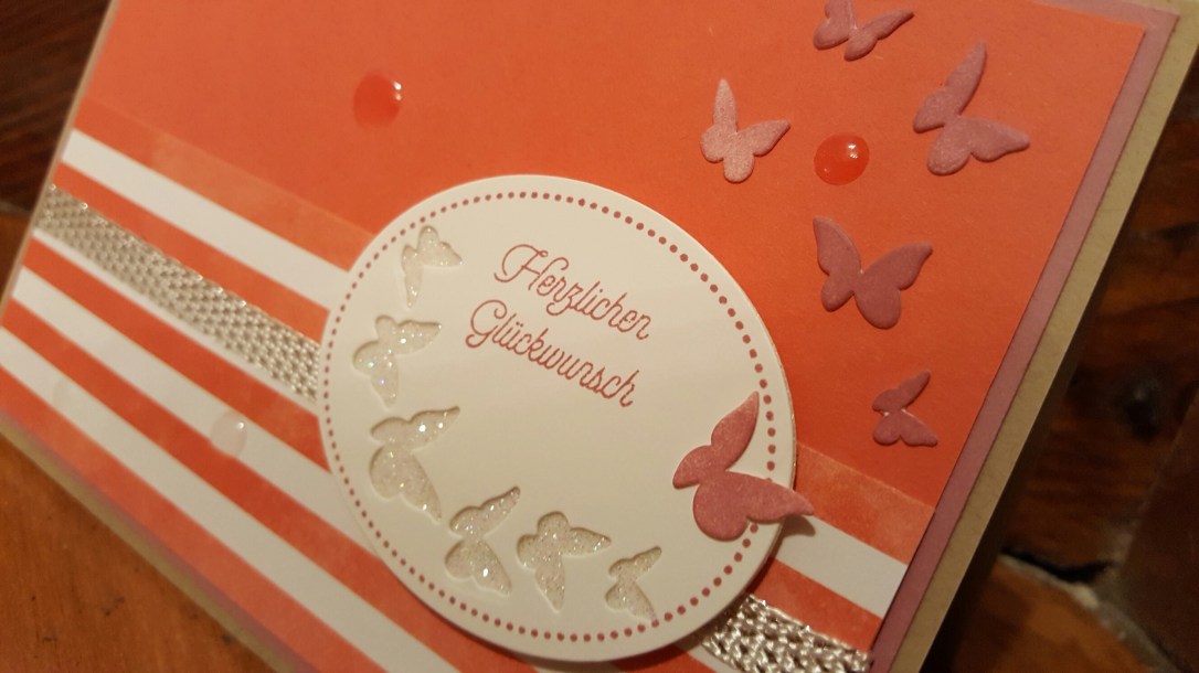 Zur Gestaltung habe ich ein Produktpaket „Anmutige Anhänger“ aus dem Frühjahr- Sommerkatalog 2017 genutzt. Natürlich habe ich den Anhänger mit Glitzerkarton in weiß hinterlegt und die ausgestanzten Schmetterlinge habe ich in Zarte Pflaume mit dem Fingerschwamm eingefärbt. Die Schmetterlinge dürfen doch nicht ungenutzt bleiben.