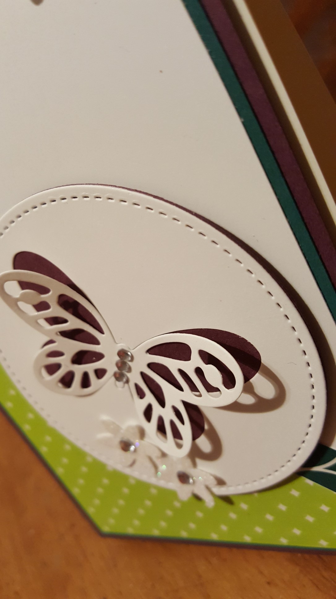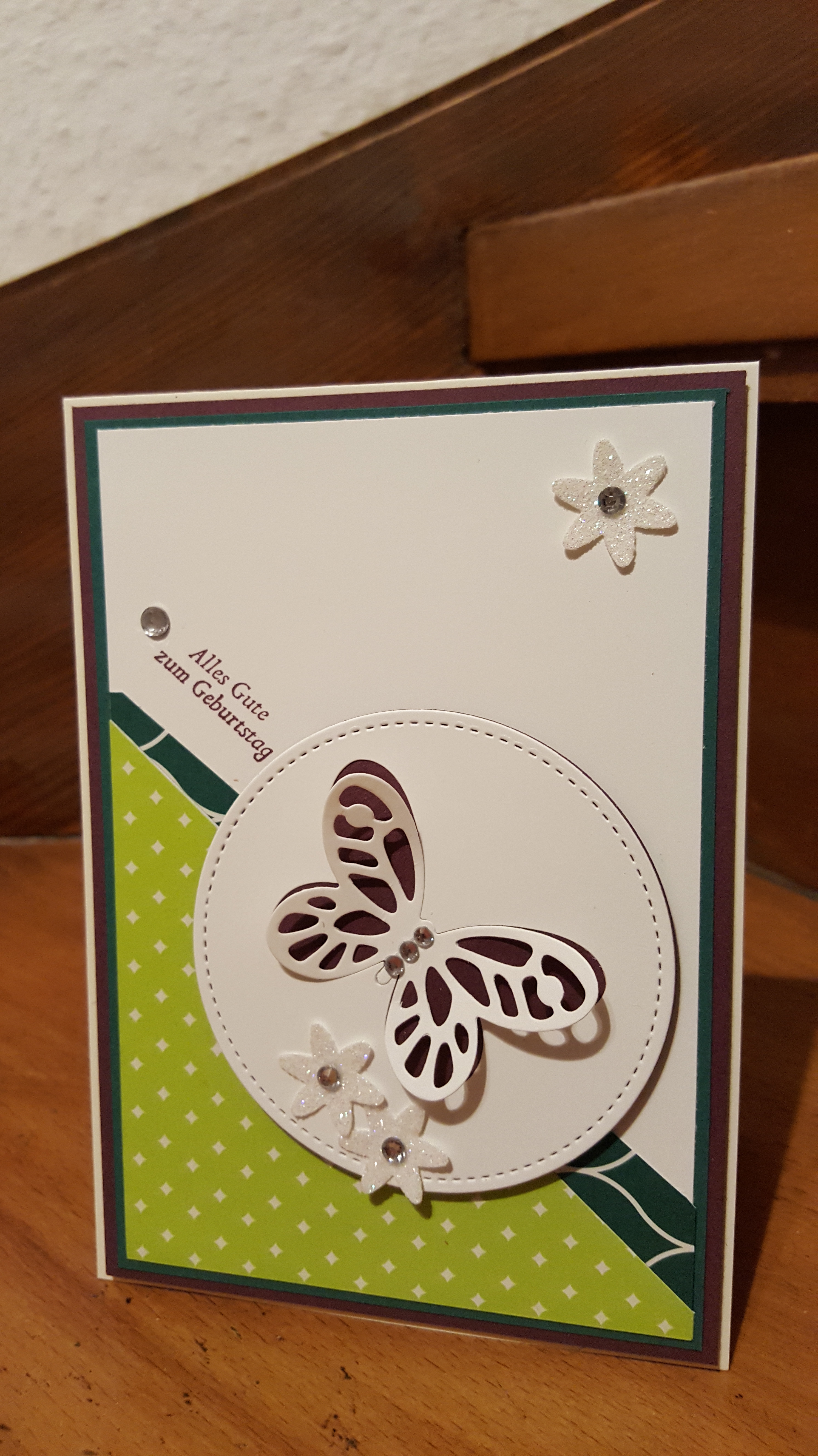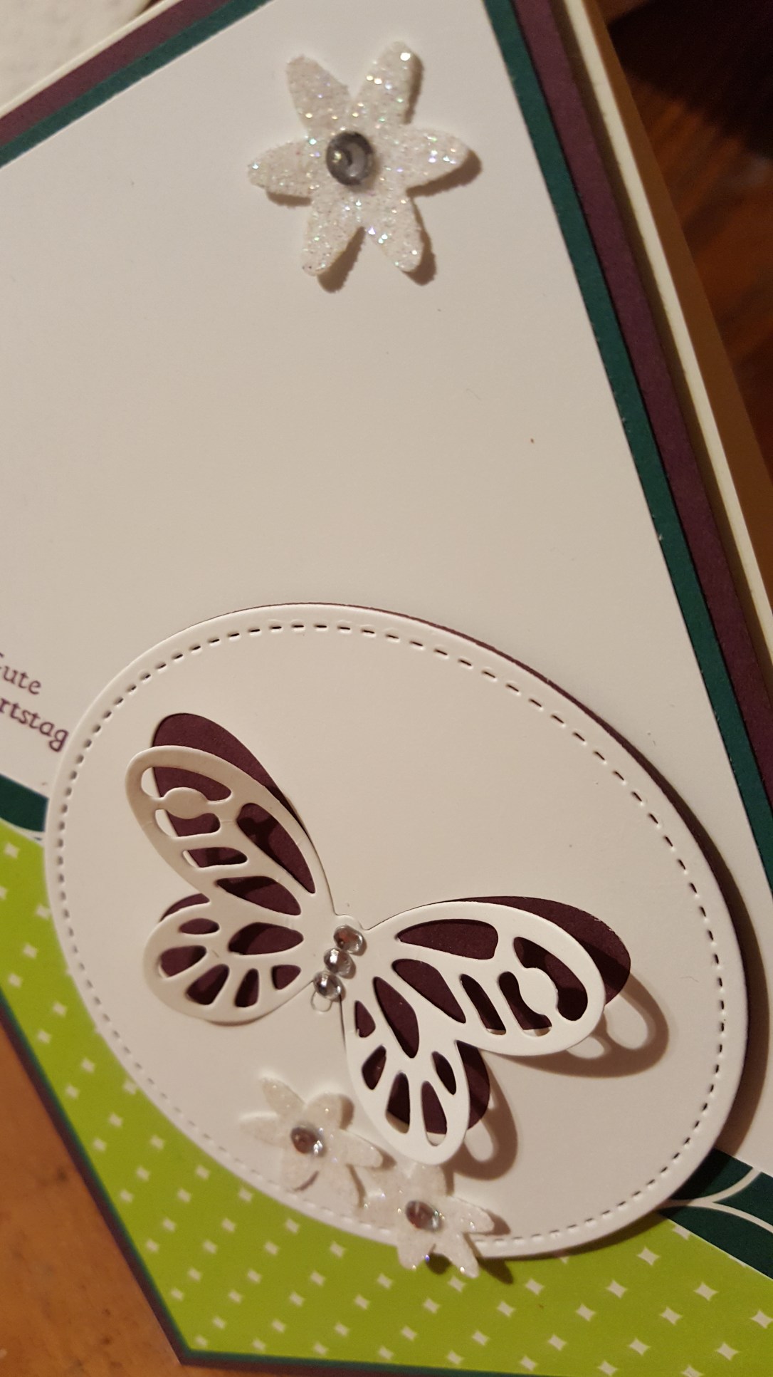 Meine Freundin liebt Schmetterlinge und deshalb war mir klar, die Karte wird trotz des Besonderen Designerpapiers Orientpalast nicht orientalisch. Das hätte ihr auch nicht gefallen. Also habe ich meine geliebten Thinlits Formen Schmetterling herausgeholt und den Filigranen in weiß ausgestanzt. Die Ausstanzung habe ich dann noch mal mit den Framelits Formen Stickereien ausgestanzt. Diesen Kreis habe ich dann noch mal in Cardstock Feige ausgestanzt und damit den weißen hinterlegt. Nun habe ich nur noch den Filigranen Schmetterling wieder in die Ausstanzung eingepasst und fertig war mein Hauptmotiv.