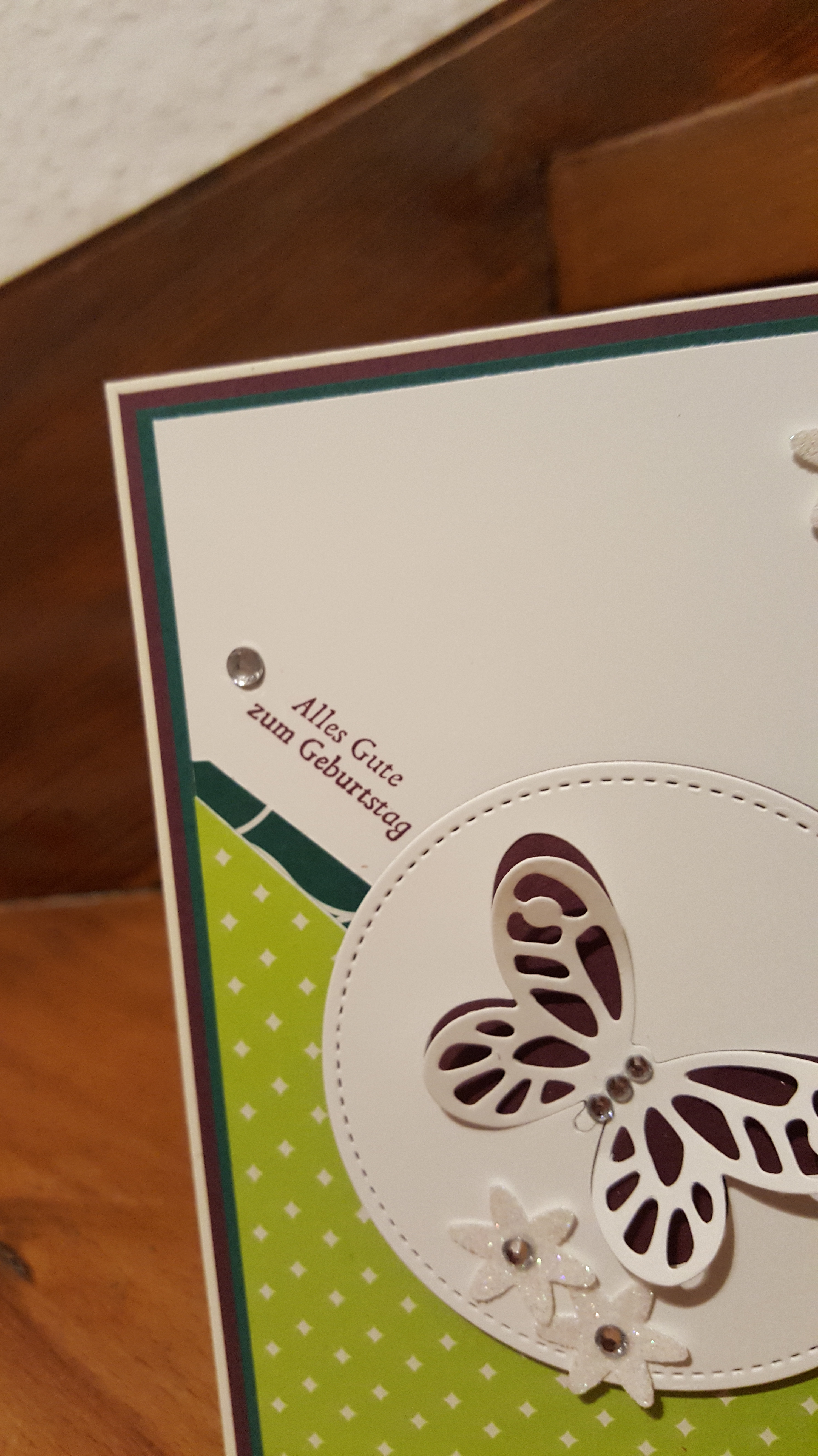 Passend zum Schmetterling habe ich noch drei kleine Blüten mit der Handstanze Dreierlei Blüten ausgestanzt und auf der Karte verteilt. Zwei davon auf den eben gestalteten Kreis. Dann habe ich sowohl den Hintergrund des Schmetterlings als auch den Schmetterling selbst mit dem Wink of Stella klar beglitzert. Könnt ihr das sehen?