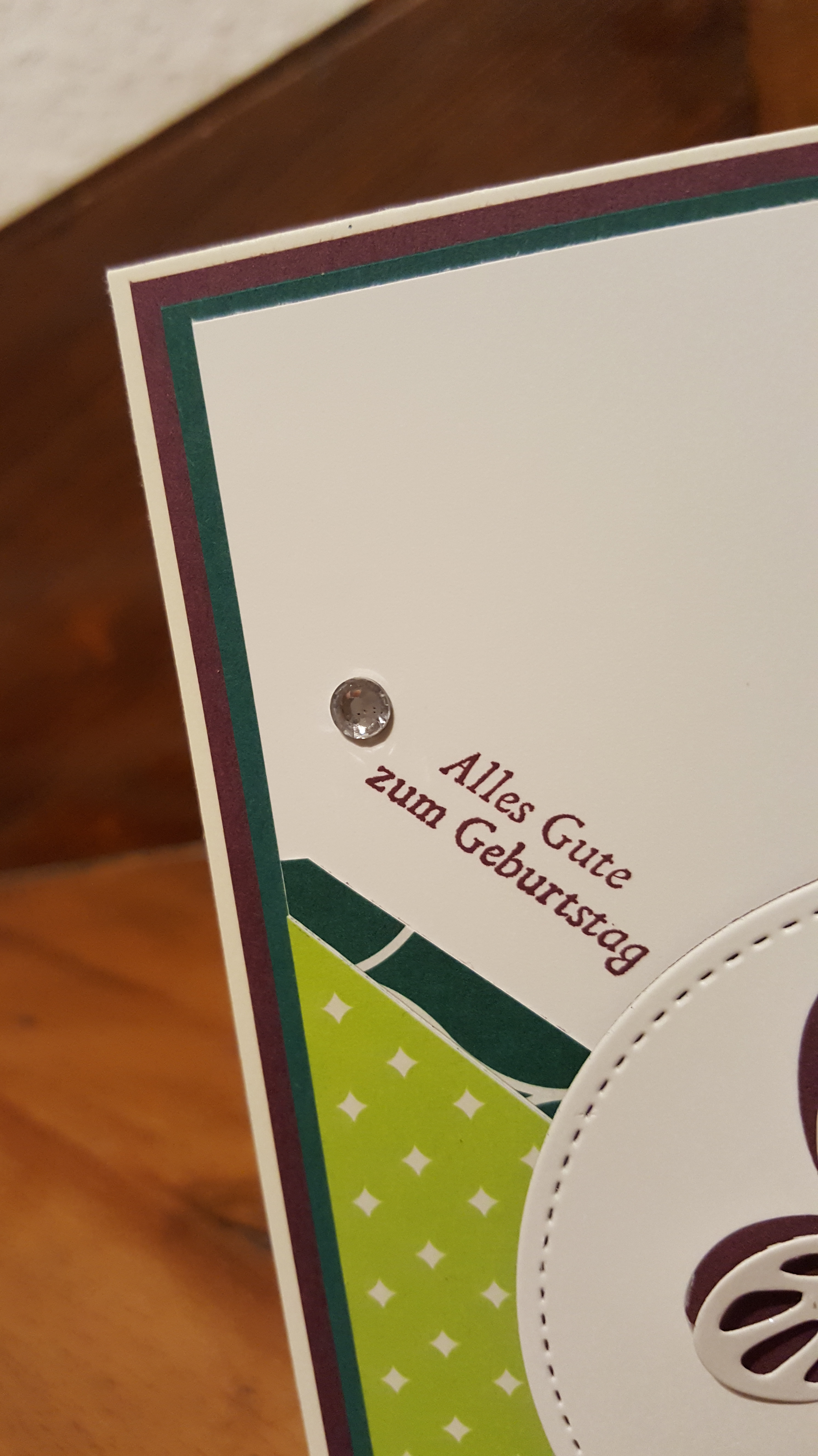 Und natürlich darf der Glückwunsch nicht fehlen. Ich habe mich für den kleinen Spruch „Alles Gute zum Geburtstag “ aus dem Stempelset Besondere Wünsche entschieden und ihn in Feige gestempelt. Eine tolle Farben, finde ich.