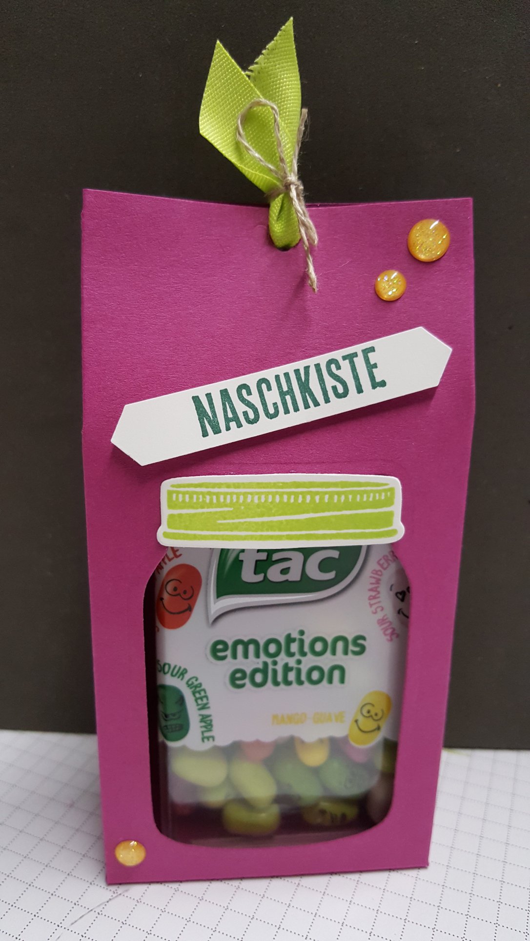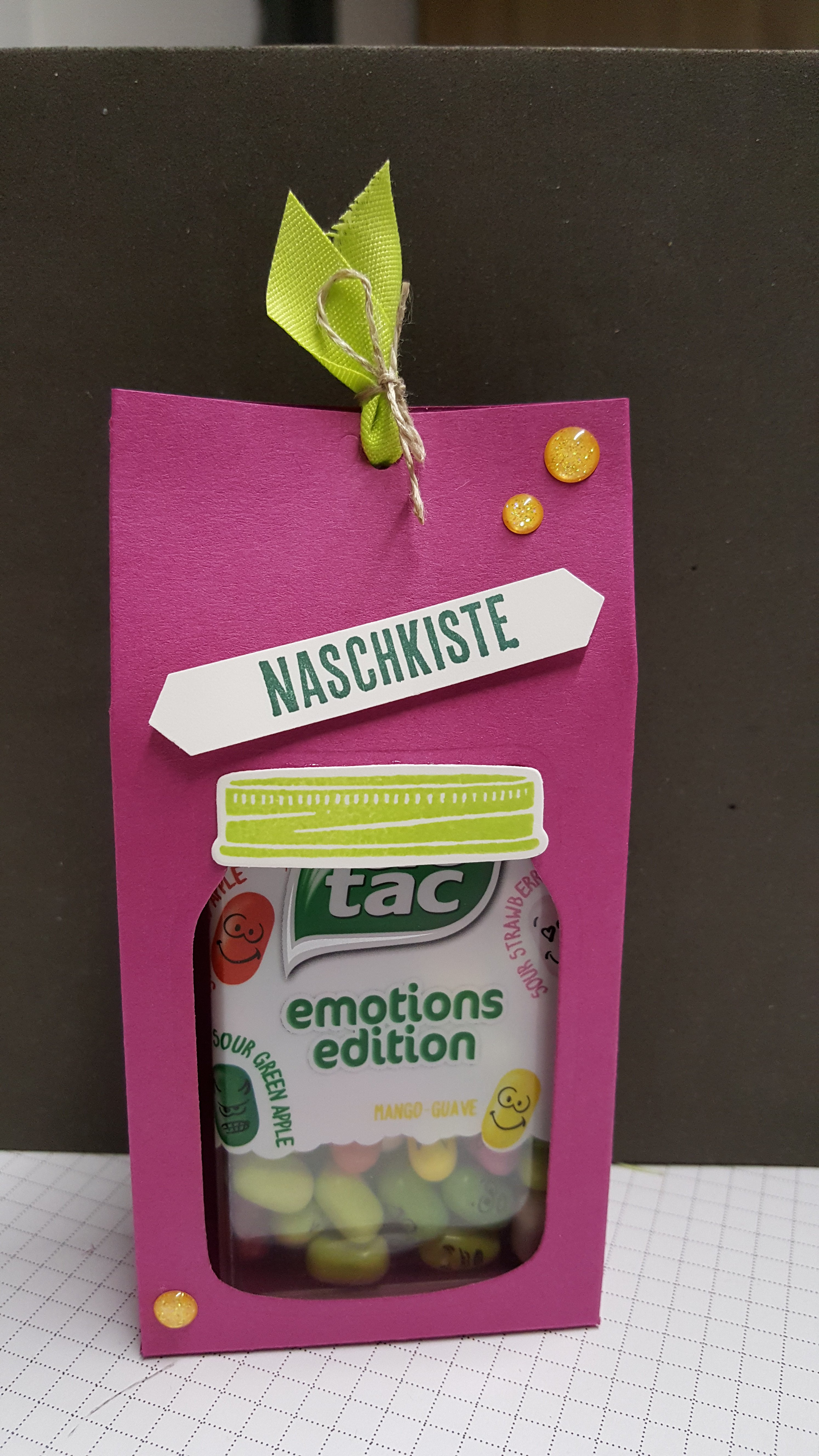 Genutzt habe ich das Stempelset Glasklare Grüße mit den passenden Framelits Formen von stampin up. Den Schriftzug „Naschkiste“ findet ihr im neuen Stempelset „Kreativkiste“. Die Verpackung selbst habe ich mit Cardstock in Sommerbeere gefertigt.  Gestempelt habe ich in Limette und Meeresgrün. Noch ein paar neue Lackakzente mit Glitzereffekt und fertig ist eine nette Verpackung.