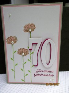 vor kurzem habe ich eine Reihe Glückwunschkarten zu runden Geburtstagen gestaltet. Eine dieser Karten habe ich mit dem neuen Stempelset Gänseblümchengruß, ergänzt um das Stempelset Blühende Worte und die Framelits Formen Große Zahlen, gestaltet. Alles das sind Produkte von stampin up. Das Stempelset Gänseblümchengruß ist aus dem neuen Jahreskatalog 2017/2018. Ihr könnt es ab dem 01.07.2017 bestellen. So sieht die Karte aus: