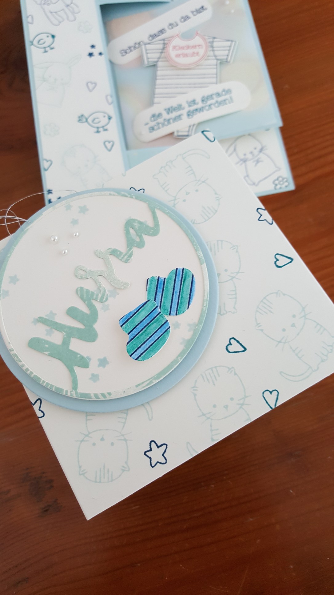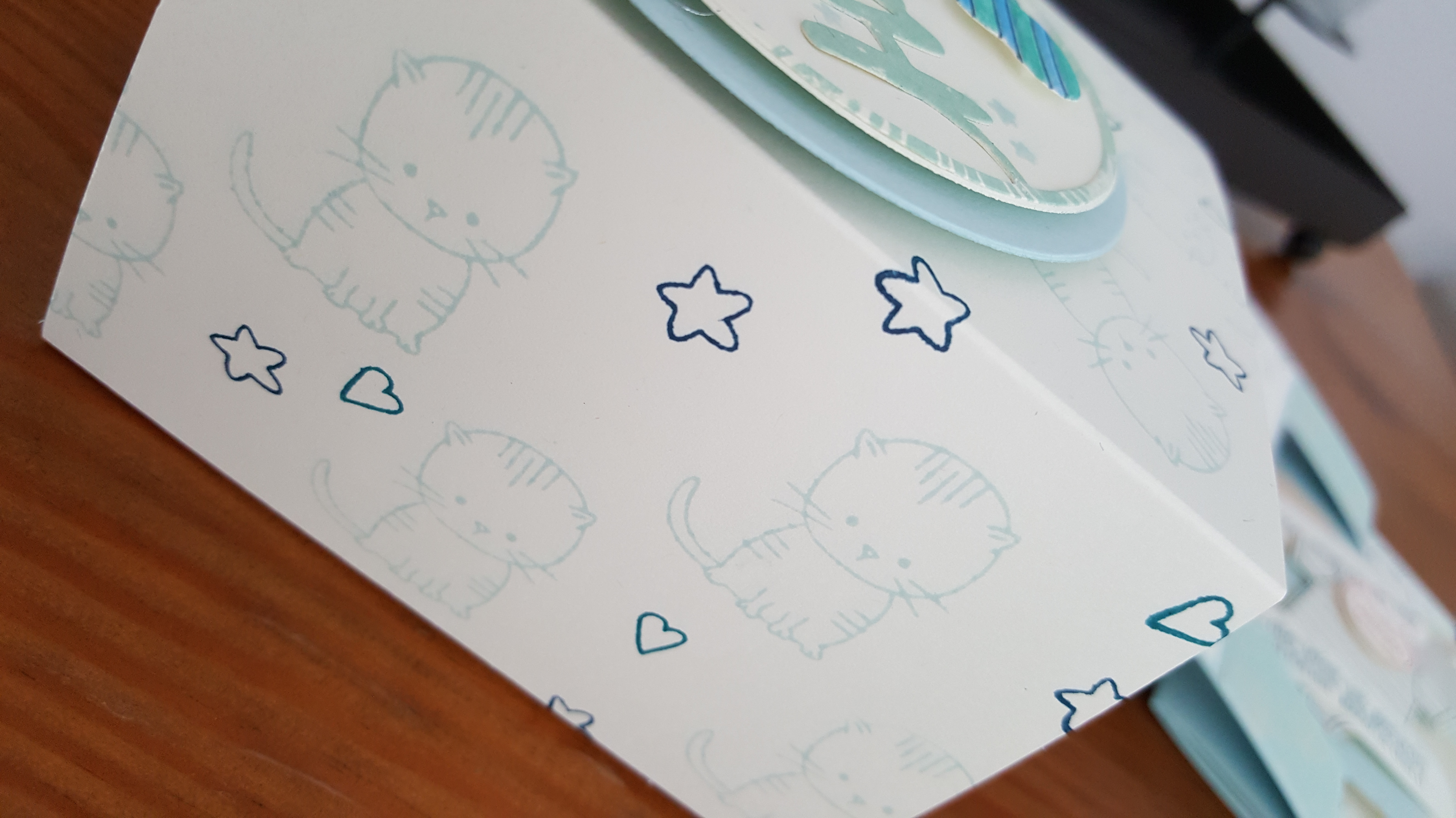 Die Banderole habe ich mit dem Stempelset Zum Nachwuchs selbst gestaltet. Da die Eltern Katzen lieben, war das Kätzchen Pflicht.