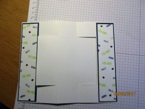 - Zuerst legt ihr die 18 cm – Seite bei 3,6 cm an und schneidet von 3 cm bis 11,6 cm runter. Dann dreht ihr das Papier um 180 °, legt es wieder bei 3,6 cm an und schneidet dort auch wieder von 3 cm runter auf die 11,6 cm.