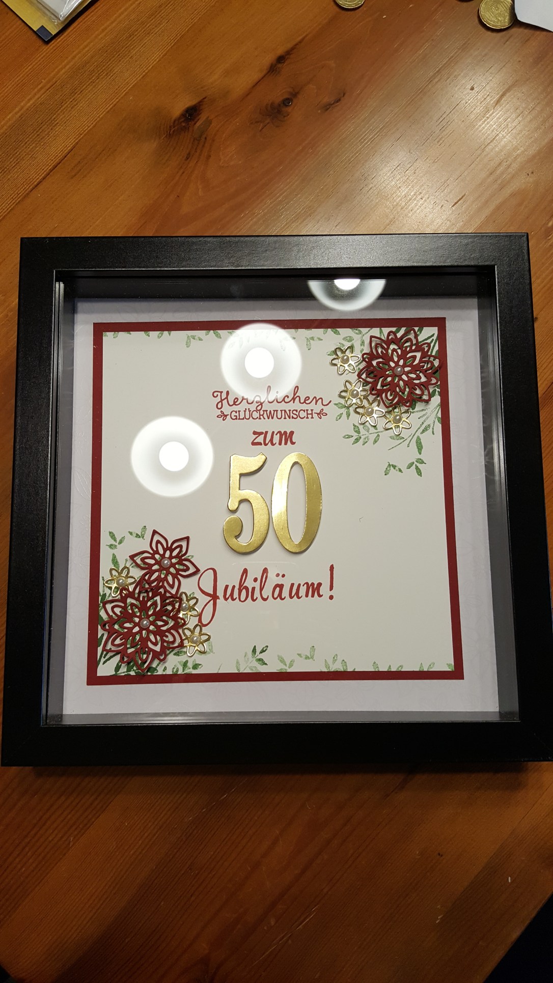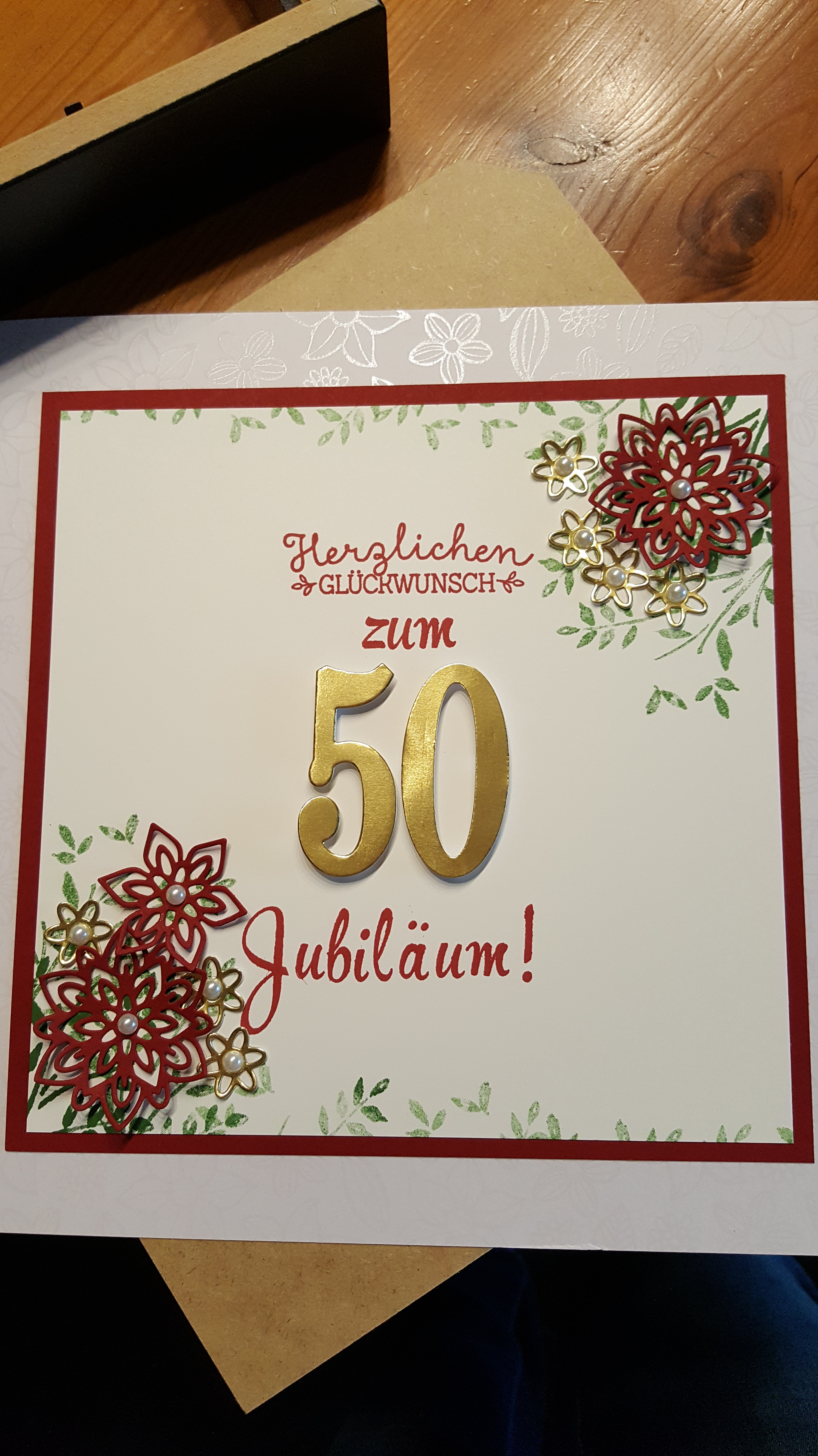 Eine gute Freundin brauchte spontan eine nette Verpackung für ein Geldgeschenk. Ein benachbarter Verein feiert sein 50zig jähriges Bestehen. Und diese Vereinigung erhält halt zu diesem Jubiläum ein Präsent. Da es sich um die kfd – katholische Frauen Deutschland – handelt, war die Farbe Chili gesetzt. Und Blumen waren gewünscht. So sieht meine Deko aus: