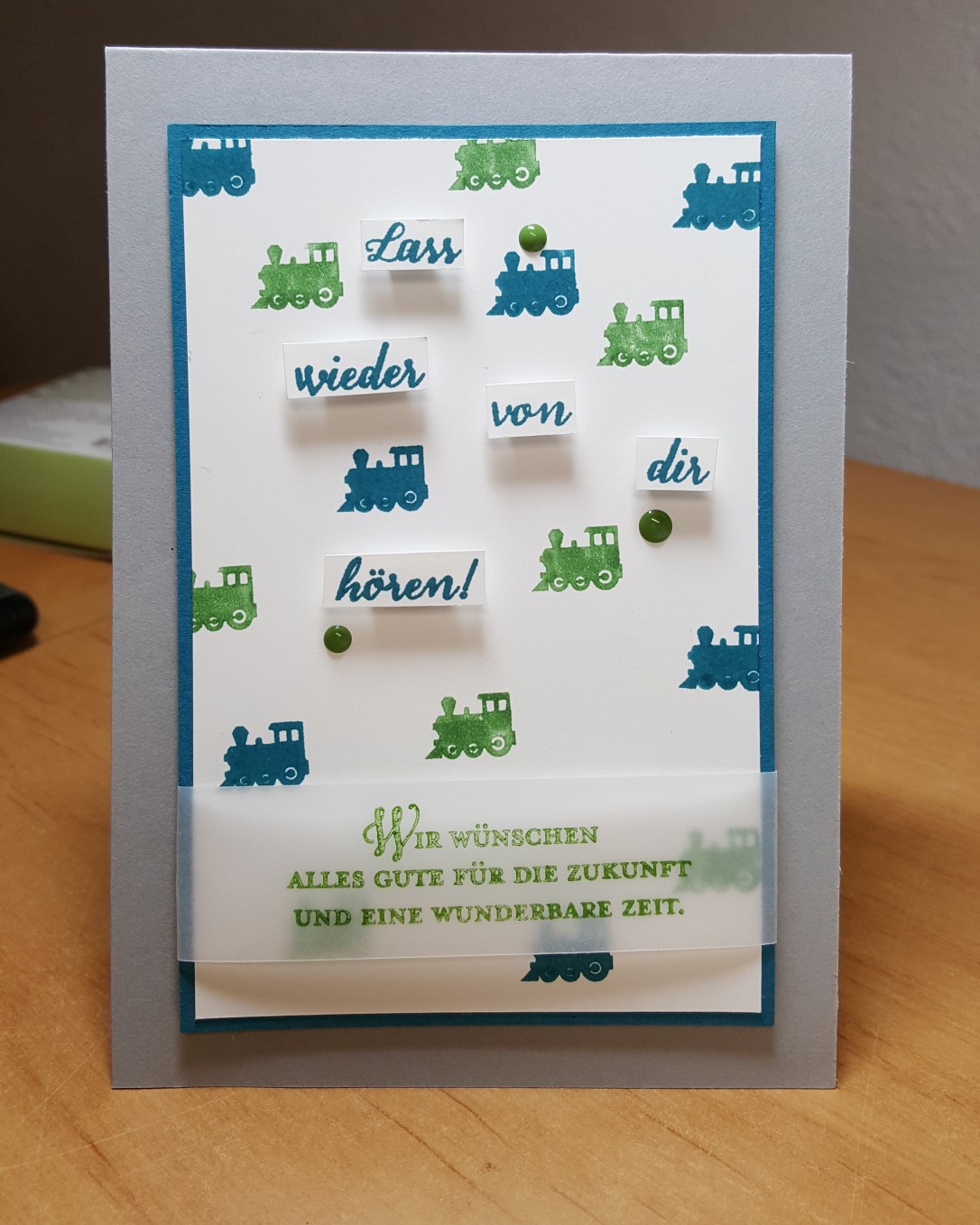 Ich habe mit der kleinen Eisenbahn mein eigenes Designerpapier hergestellt, in dem ich sie in Petrol und Gartengrün gestempelt habe. Dann habe ich den Spruch „Lass wieder von dir hören “ aus dem Stempelset „Zum neuen Abschnitt“ in Petrol gestempelt, auseinander geschnitten und mit den Schaumstoffklebestreifen in den oberen Bereich geklebt.