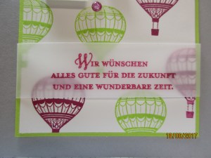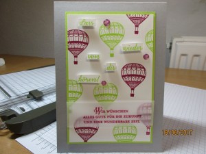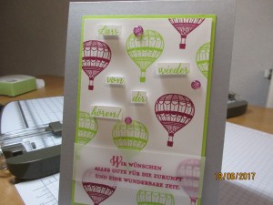 heute möchte ich euch noch eine Karte zum Abschied zeigen. Auch dieses Mal habe ich das Designerpapier selbst gestaltet. Diesmal habe ich aber den Heißluftballon aus „Abgehoben“ von stampin up genutzt. Schaut selbst:
