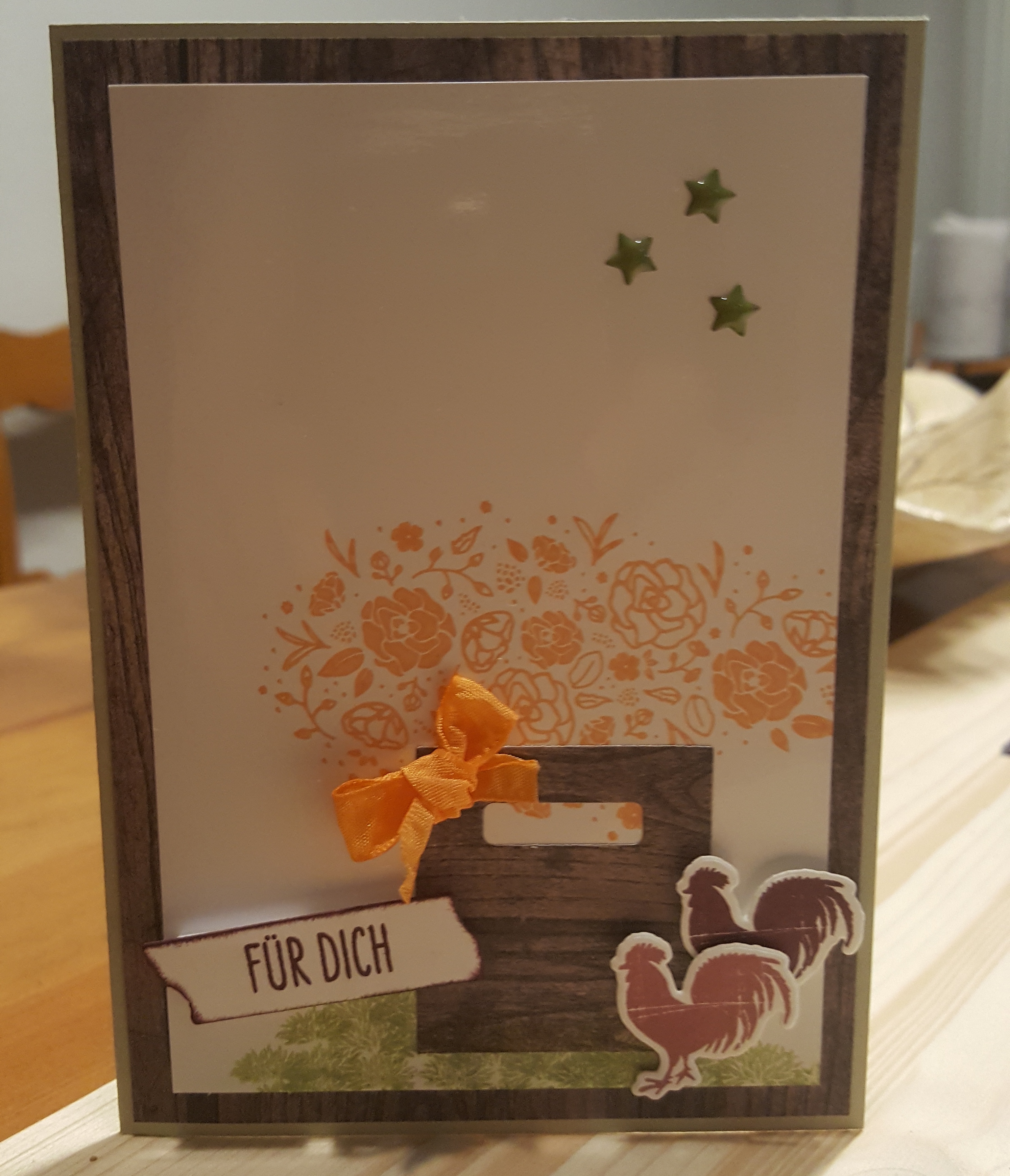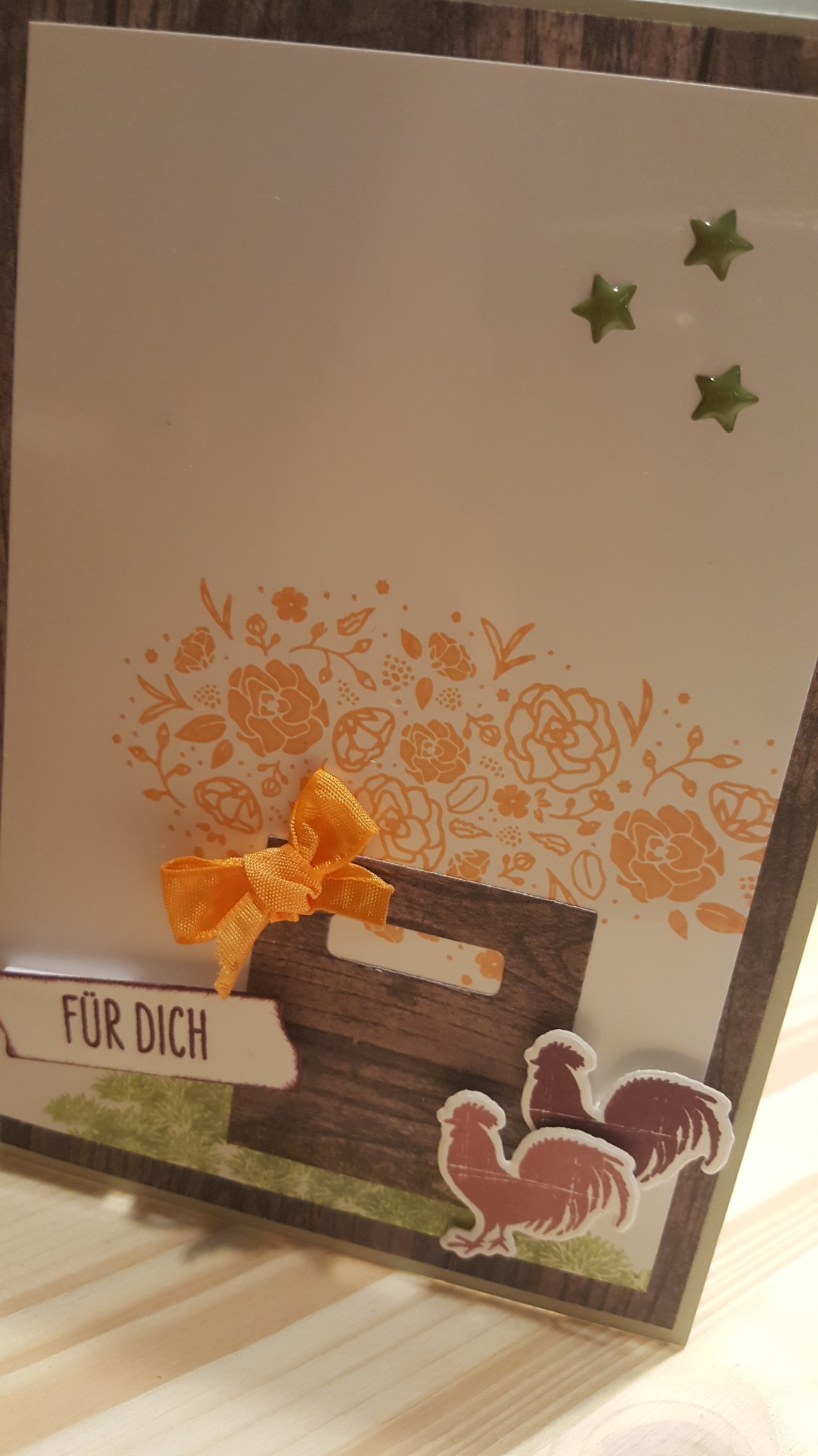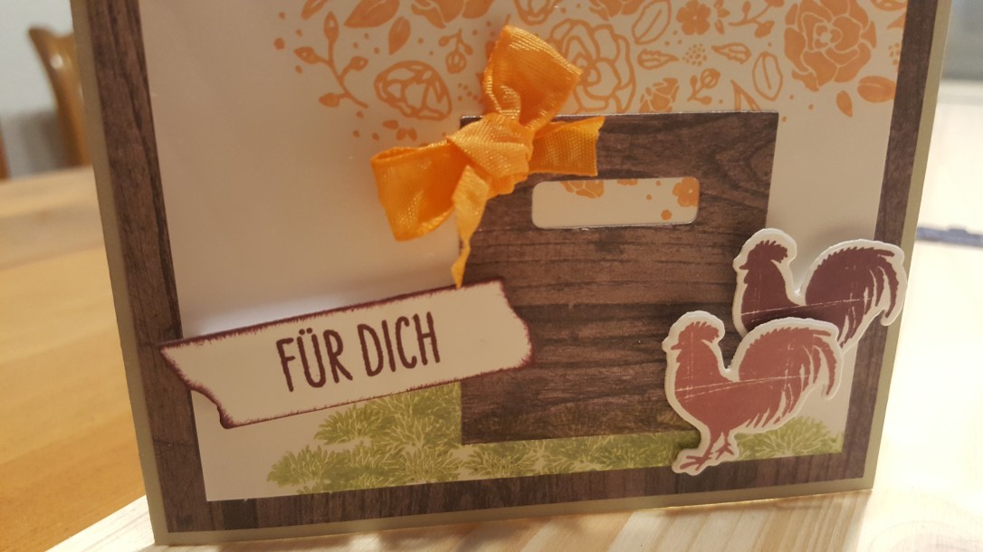 Den Korb habe ich aus den Framelits Formen Holzkiste ausgestanzt. Allerdings nur das Seitenteil. Hier habe ich im unteren Bereich „Grasbüschel“ gestempelt. Das sind eigentlich Blütenstände aus dem Stempelset Zum neuen Abschnitt. Passt aber auch als Gras, oder?