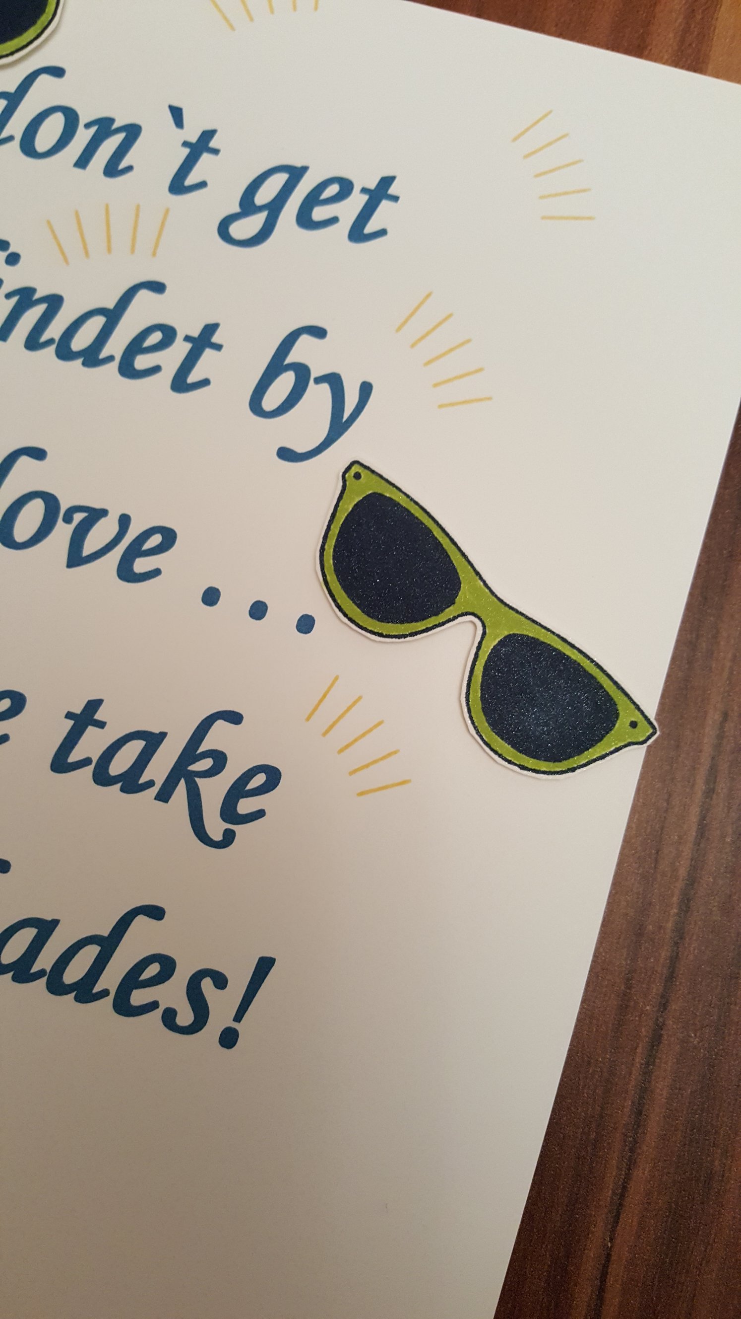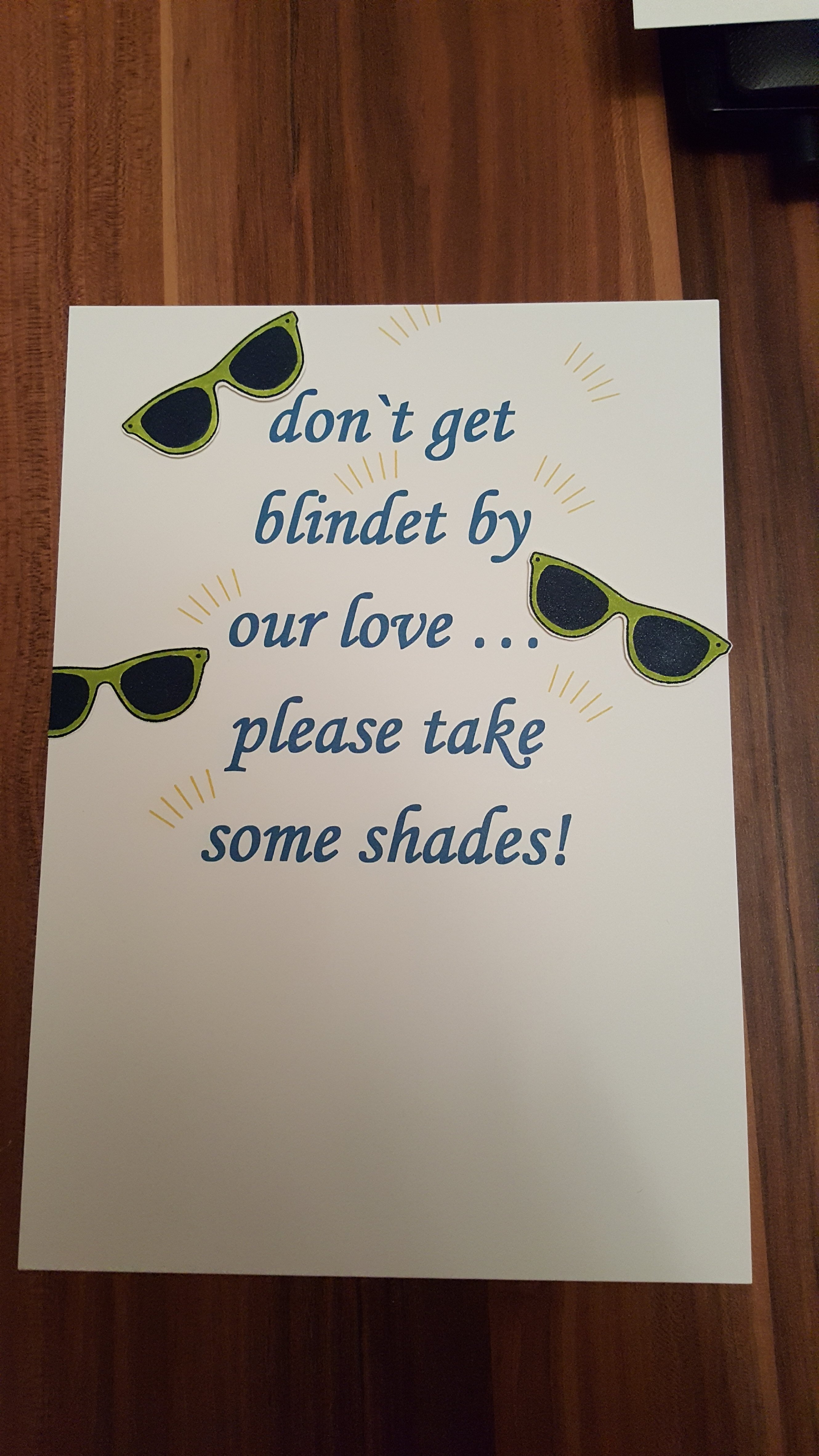 Das zweite Schild wird einen Korb mit Sonnenbrillen zieren. Die können die Gäste für lustige Fotos nutzen. Klar war hier das Stempelset „Tasche voller Sonnenschein“ gesetzt. So sieht das Schild aus: