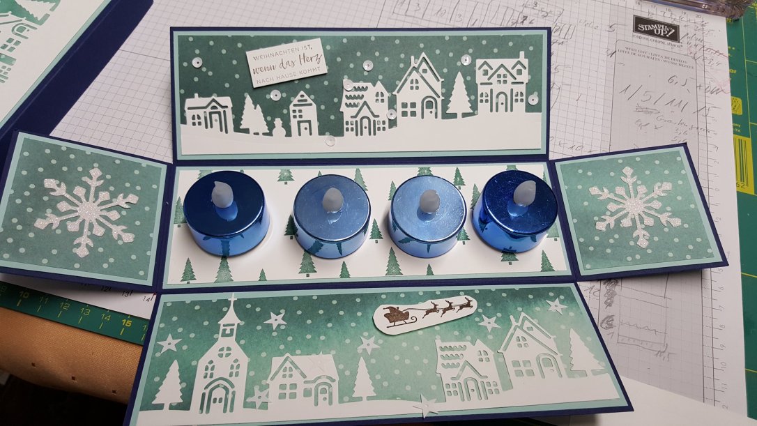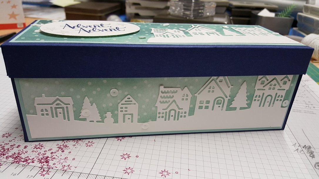 Endlich kann ich euch meinen Adventskranz to go vorstellen. Es sind als Basis längliche Explosionsboxen. So sieht die erste Variante aus: