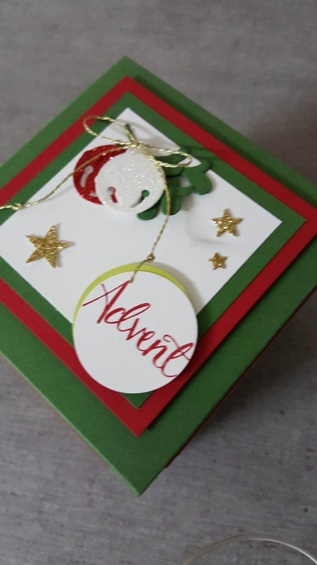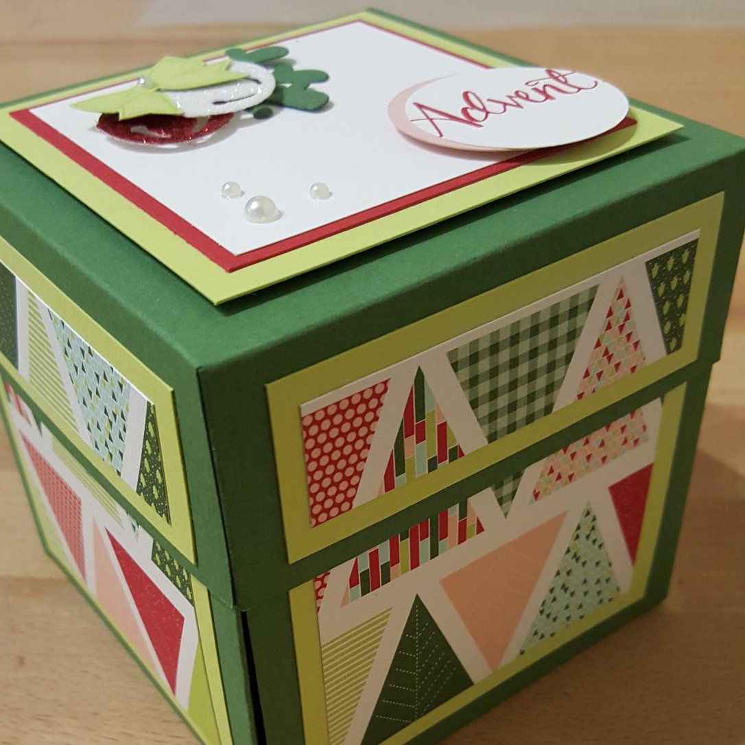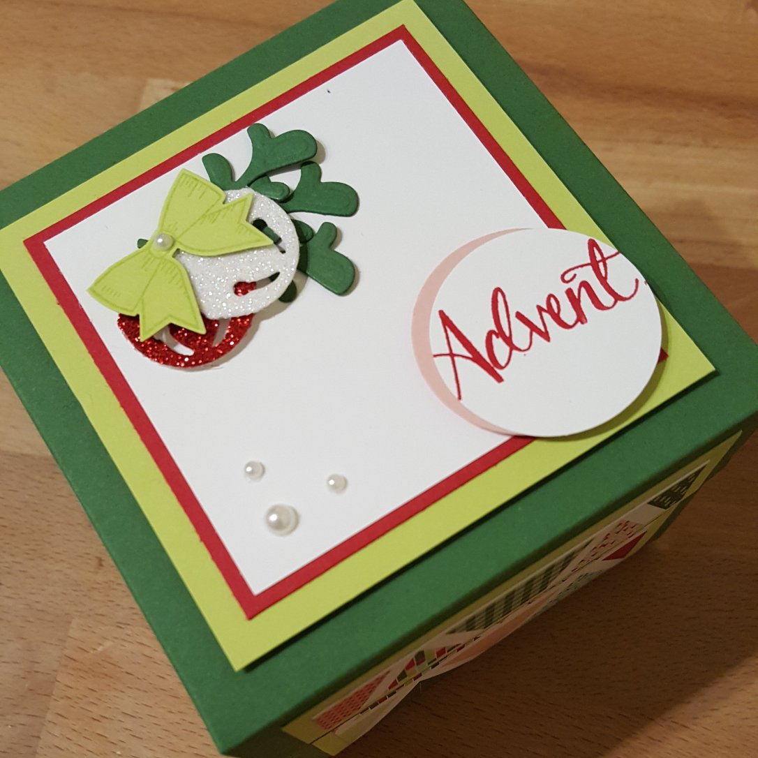 Dieser Adventskranz to go ist – ganz einfach – eine große Explosionsbox in den Maßen 10 cm * 10 cm. Ihr braucht dafür Cardstock in der Größe 30 cm * 30 cm und falzt dieser rundherum bei 10 cm.