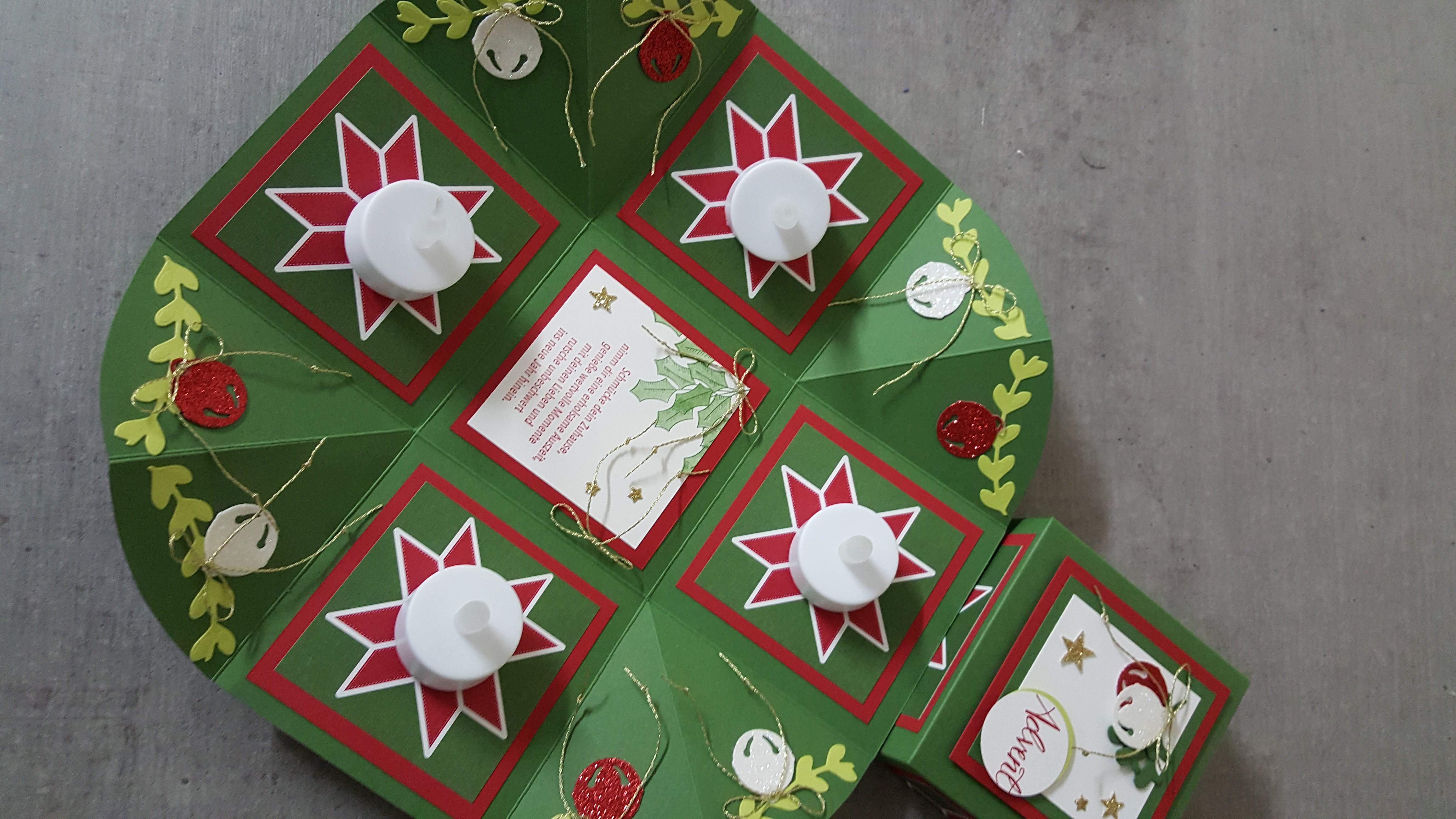 Dieser Adventskranz to go ist – ganz einfach – eine große Explosionsbox in den Maßen 10 cm * 10 cm. Ihr braucht dafür Cardstock in der Größe 30 cm * 30 cm und falzt dieser rundherum bei 10 cm.